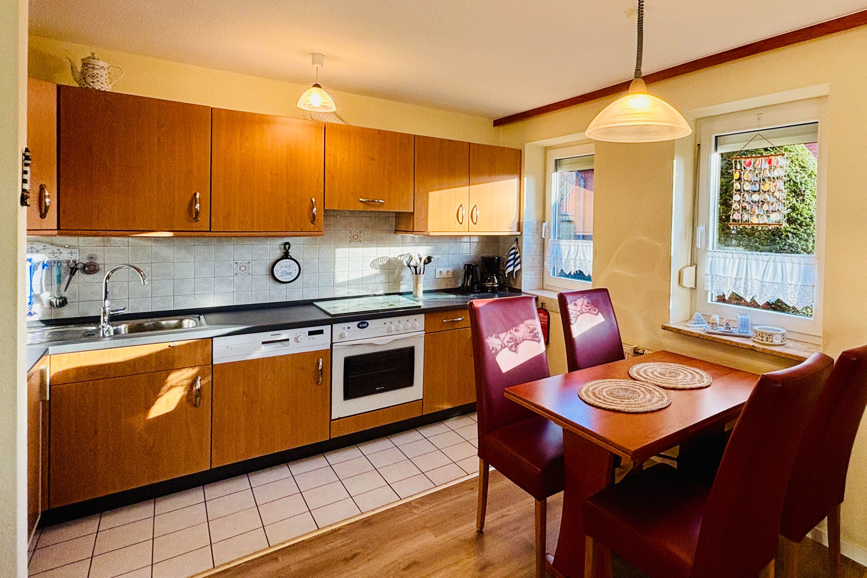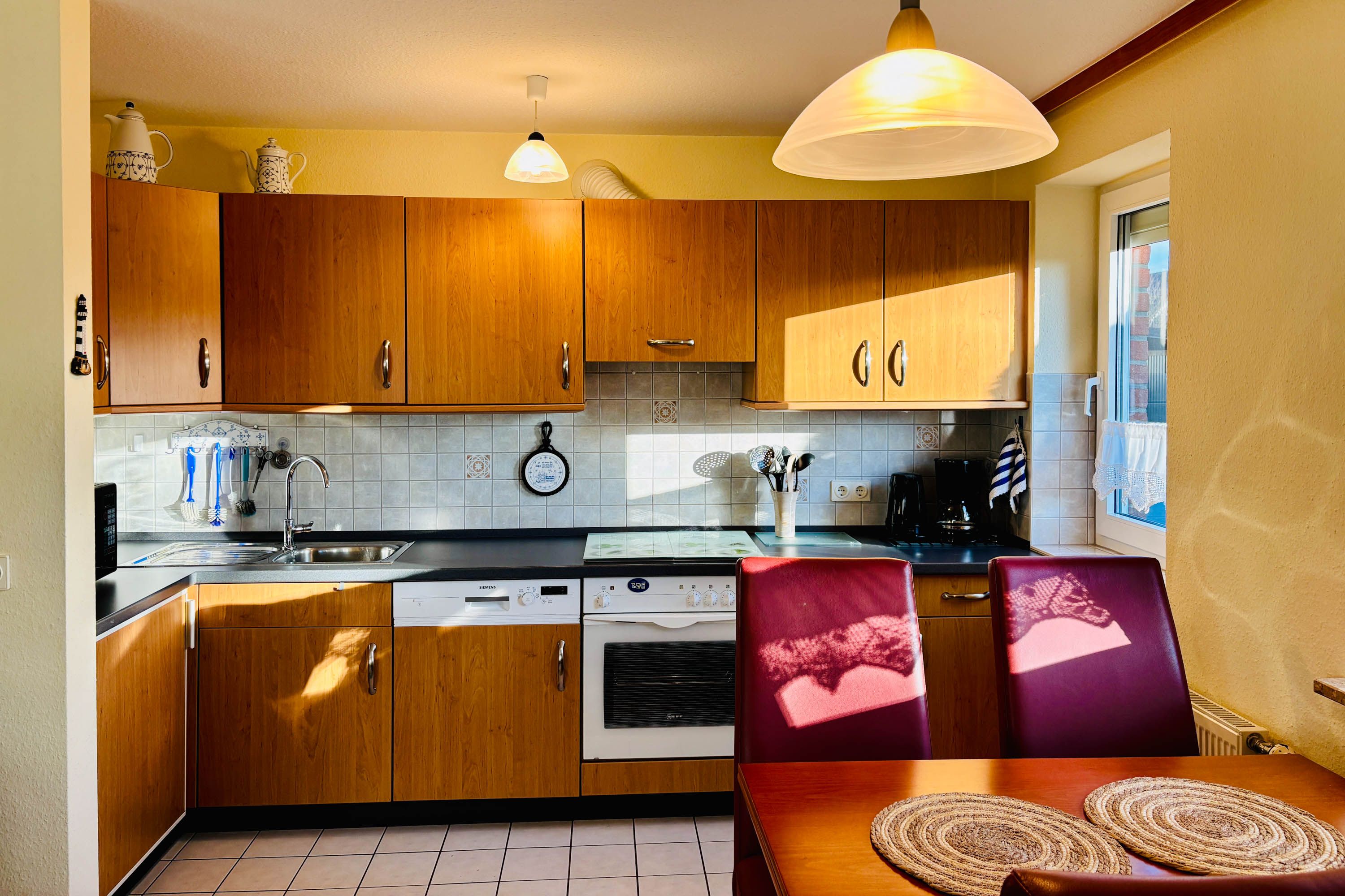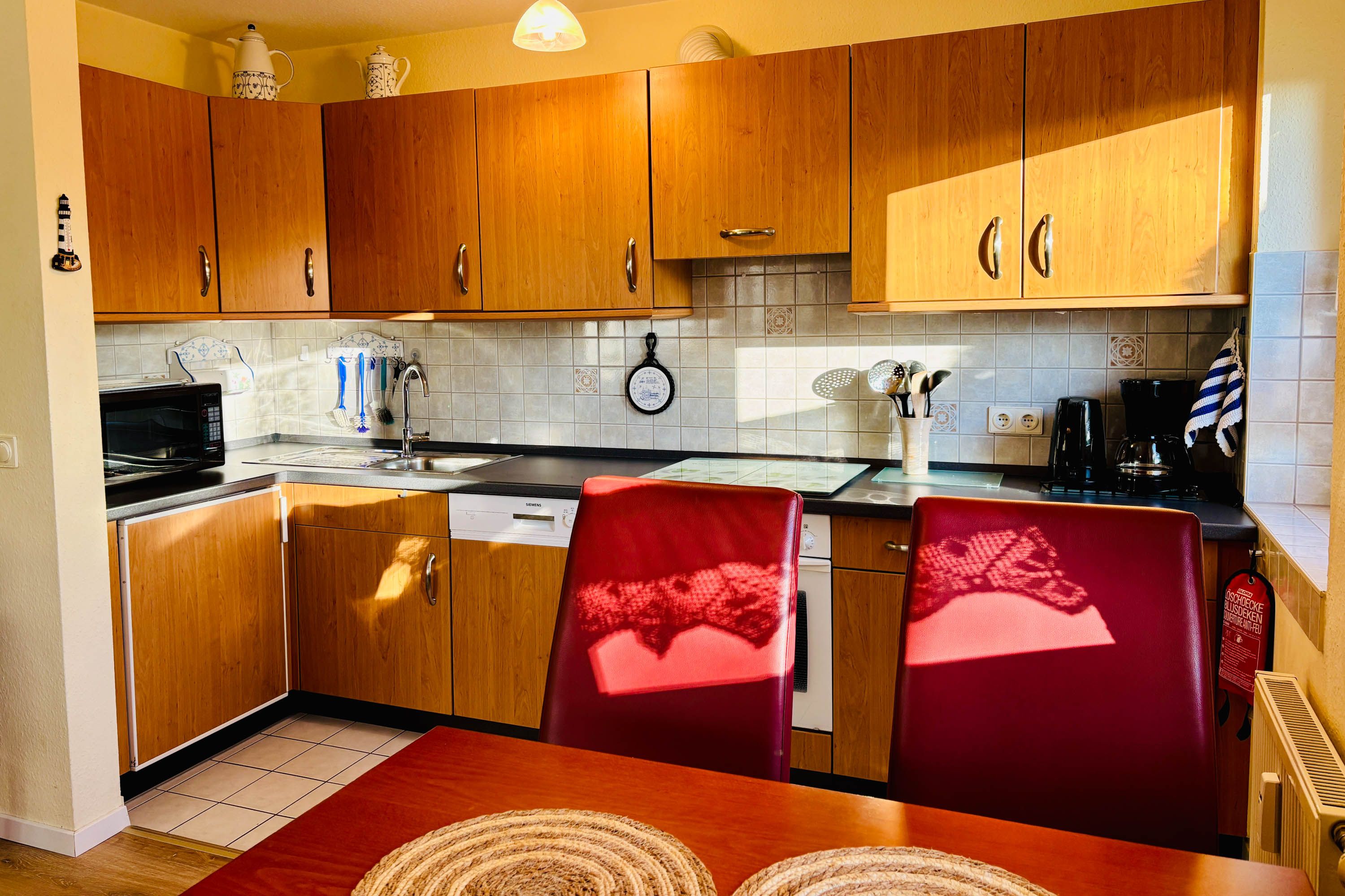 Einbauküchenzeile, Geschirrspüler, Kühlschrank mit Eisfach, Cerankochfeld, Backofen, Kaffeemaschine (Filter), Toaster, Mikrowelle, Wasserkocher, Waffeleisen, Eierkocher