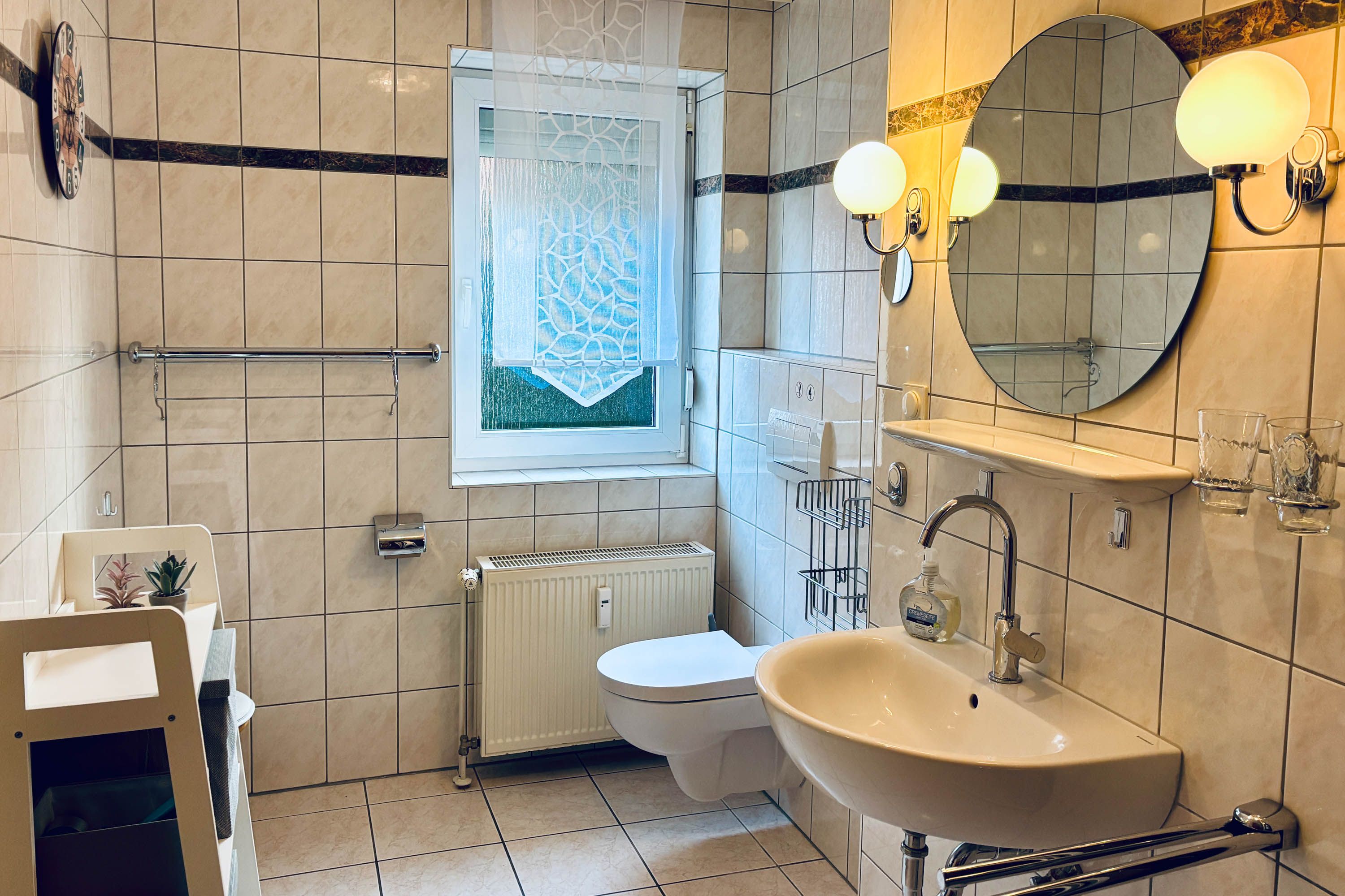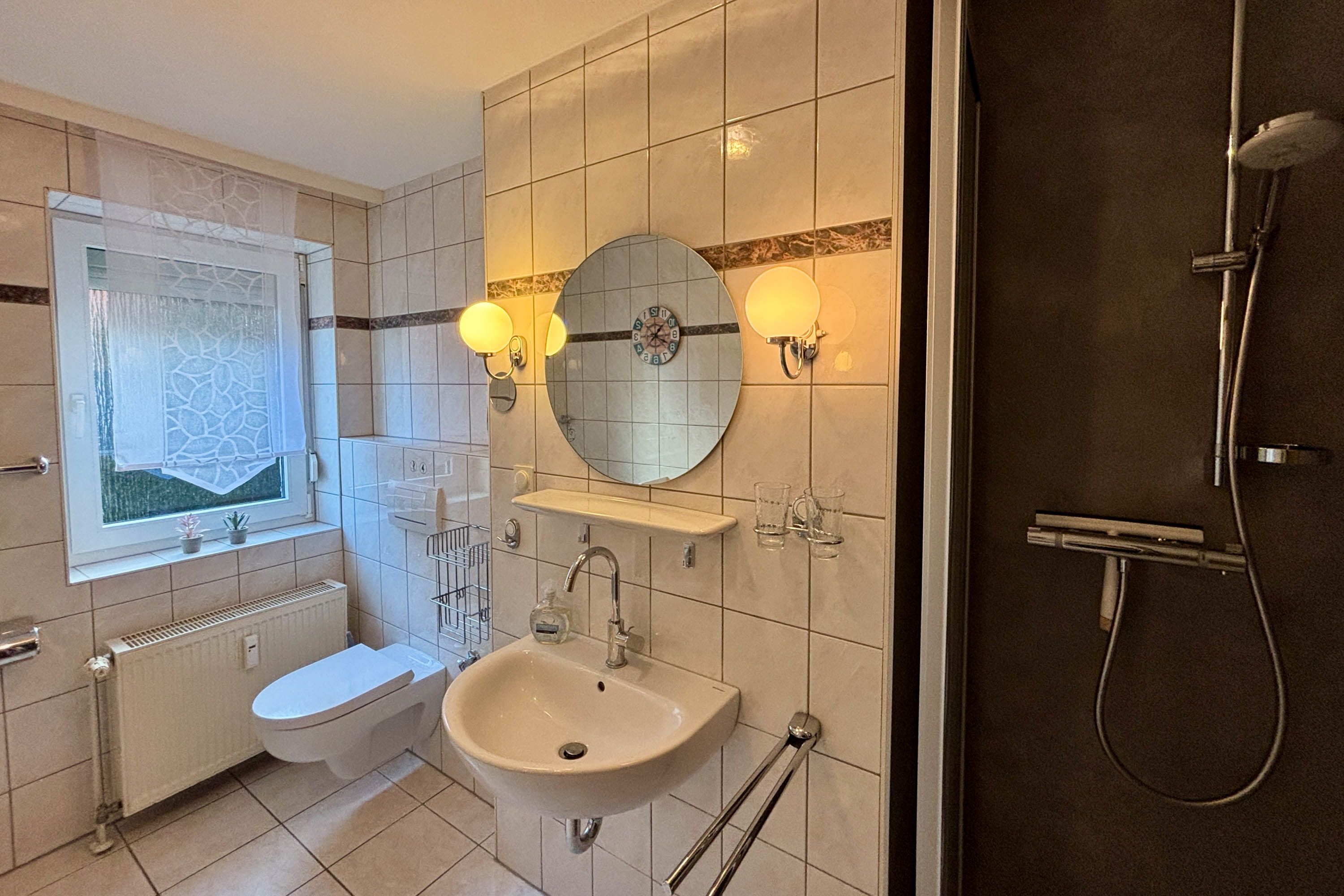 Dusche ( mit Duschwanne), WC, Waschbecken, Spiegel, Kosmetikeimer, Ganzkörperspiegel, Wanduhr, Hocker, Kommode