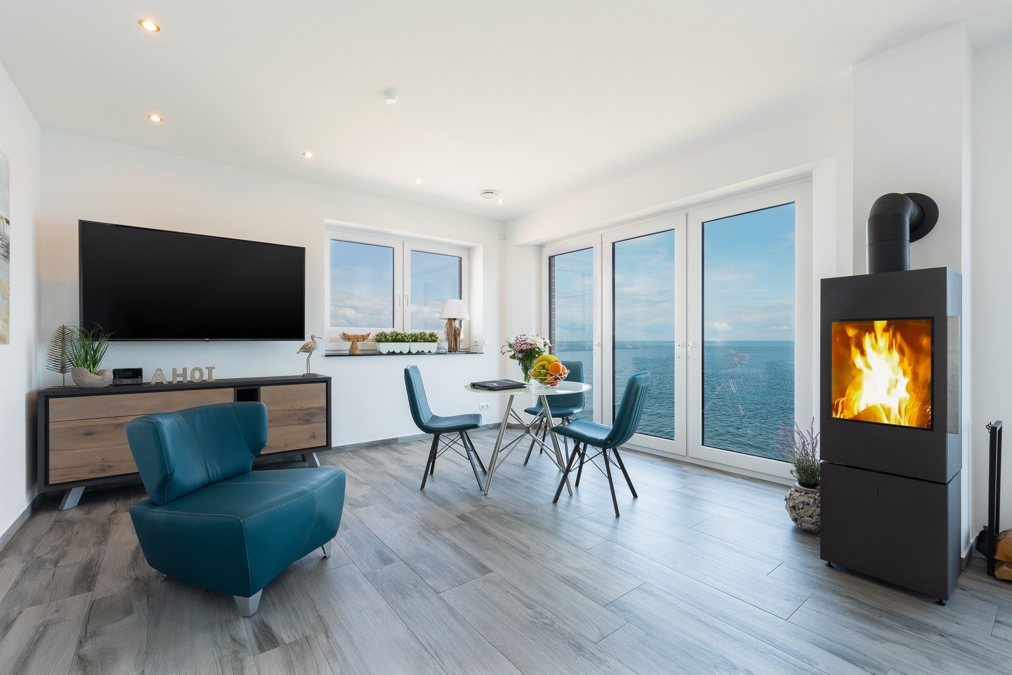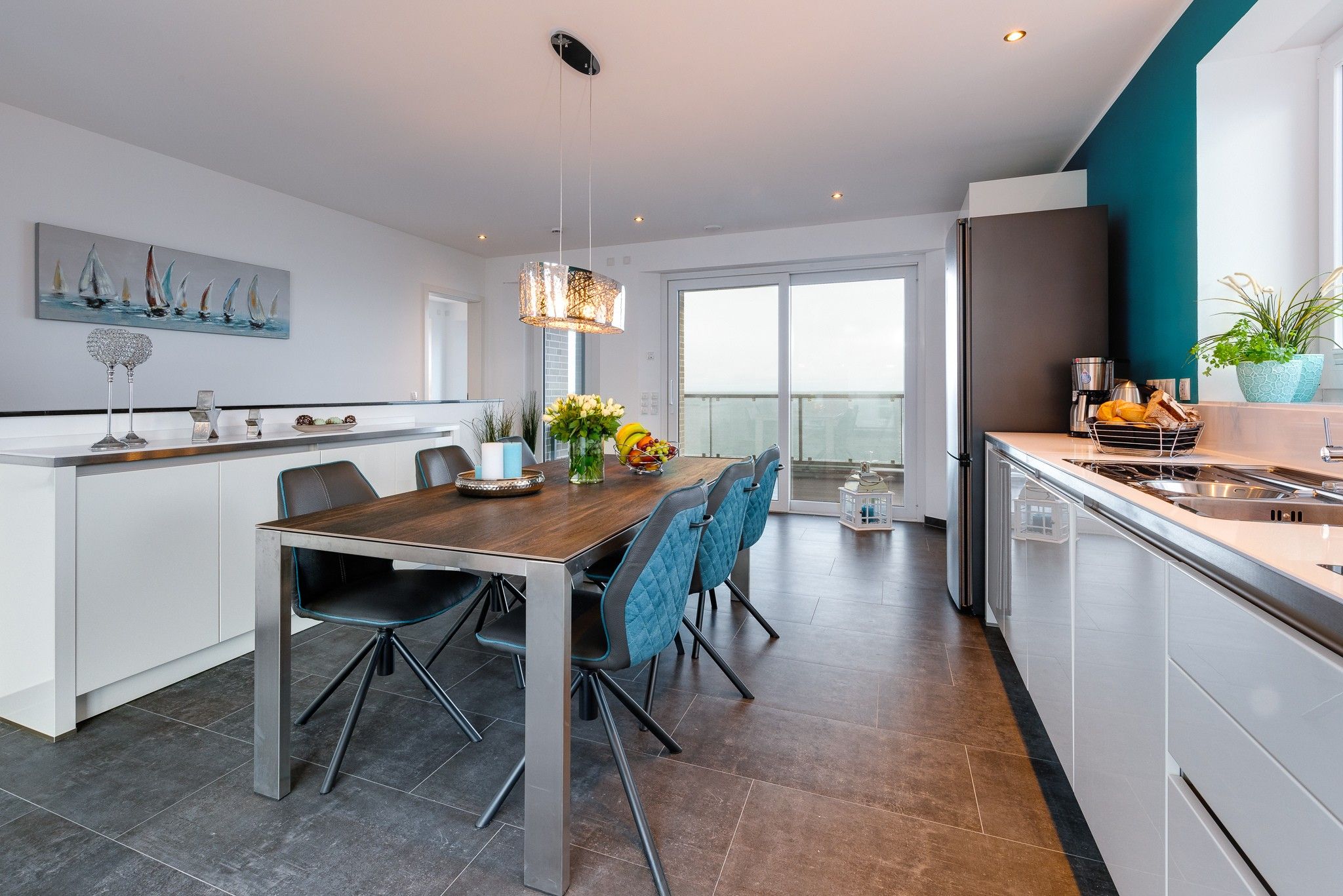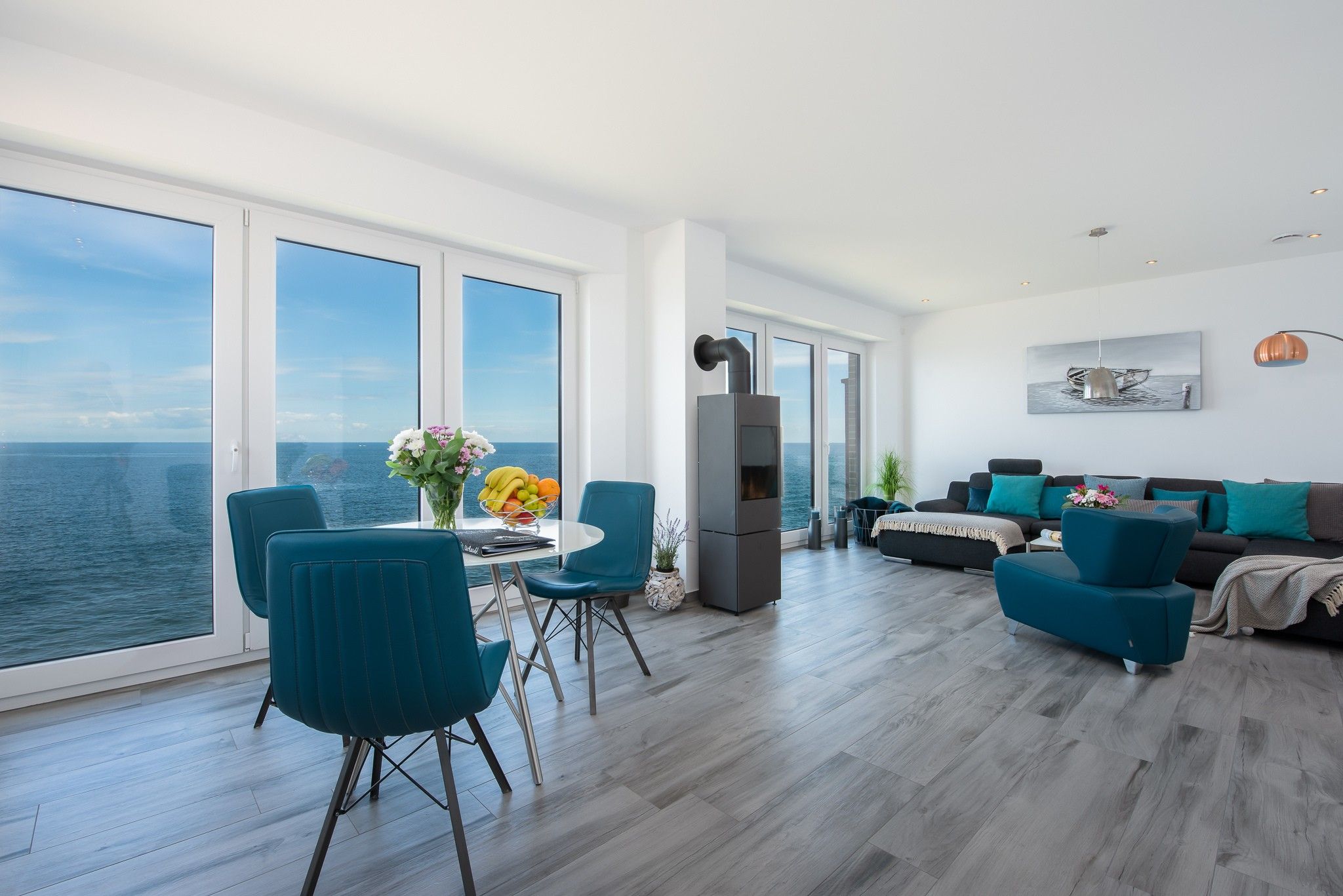 Die modern-maritime Einrichtung, ergänzt durch bodentiefe Fenster, helle Räume und einen Parkettfußboden mit Fußbodenheizung, schafft eine Atmosphäre der Gemütlichkeit und Eleganz. Der offene Küchen- und Essbereich lädt dazu ein, beim Kochen die freie Sicht auf die Ostsee zu genießen.