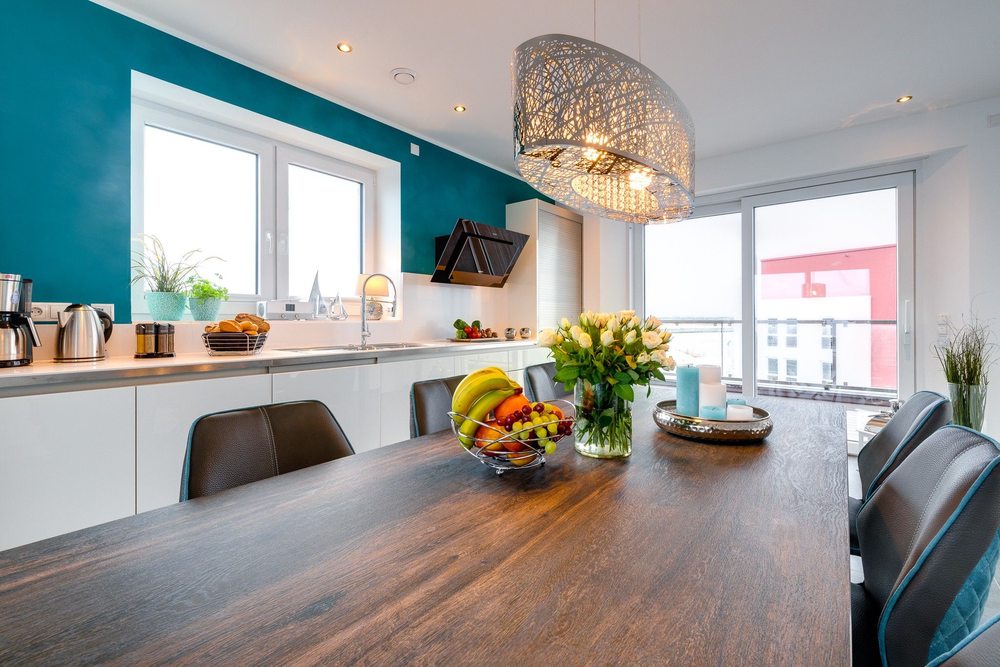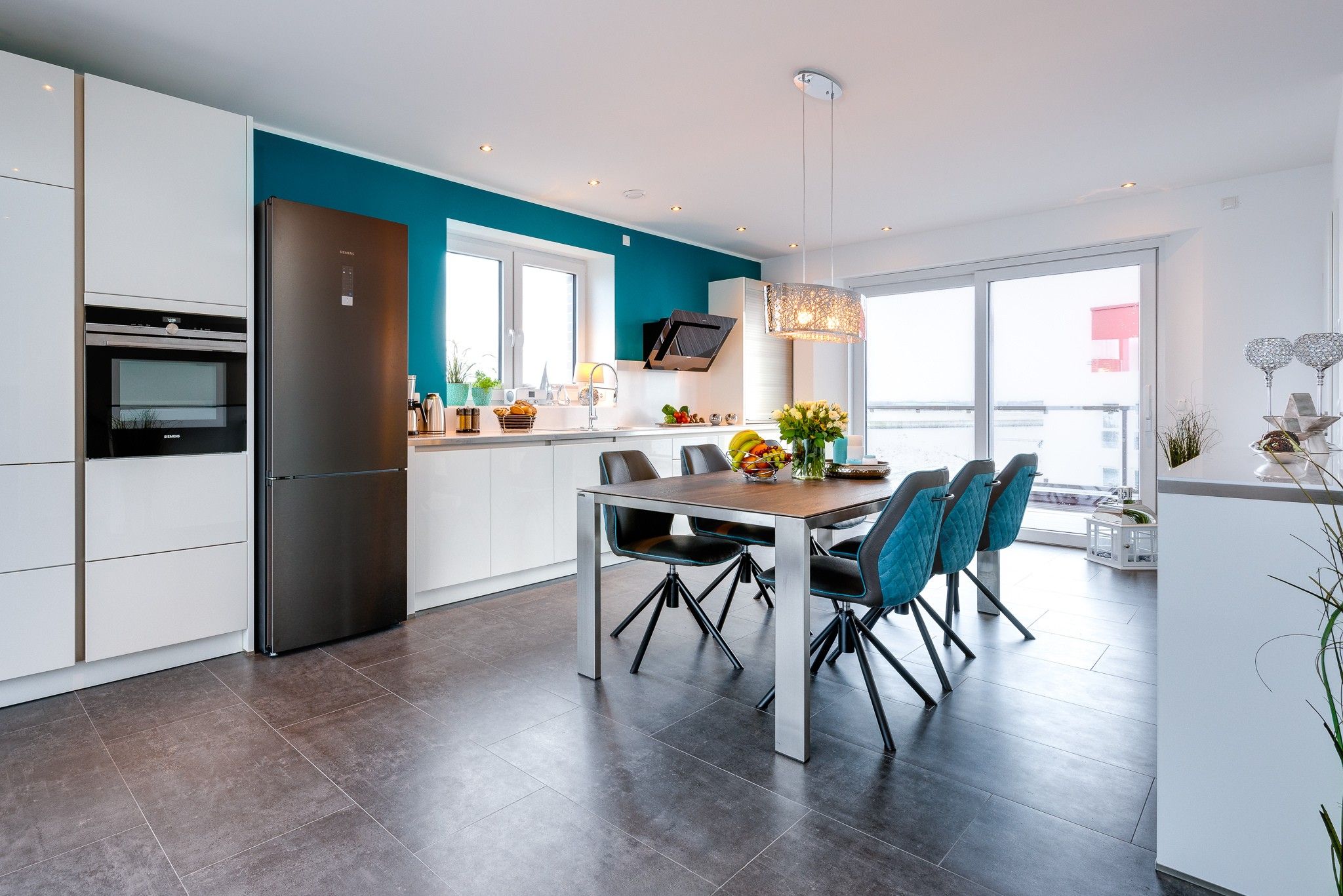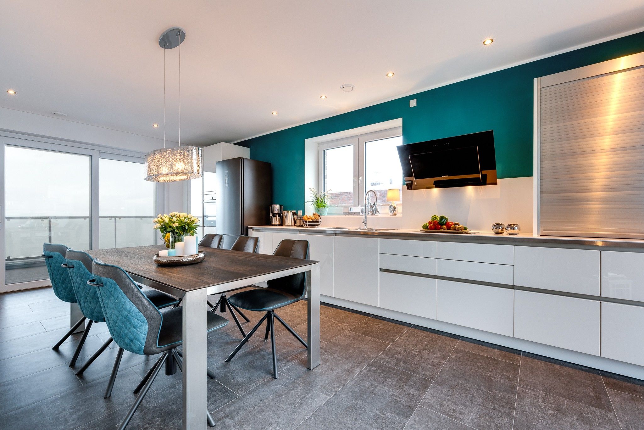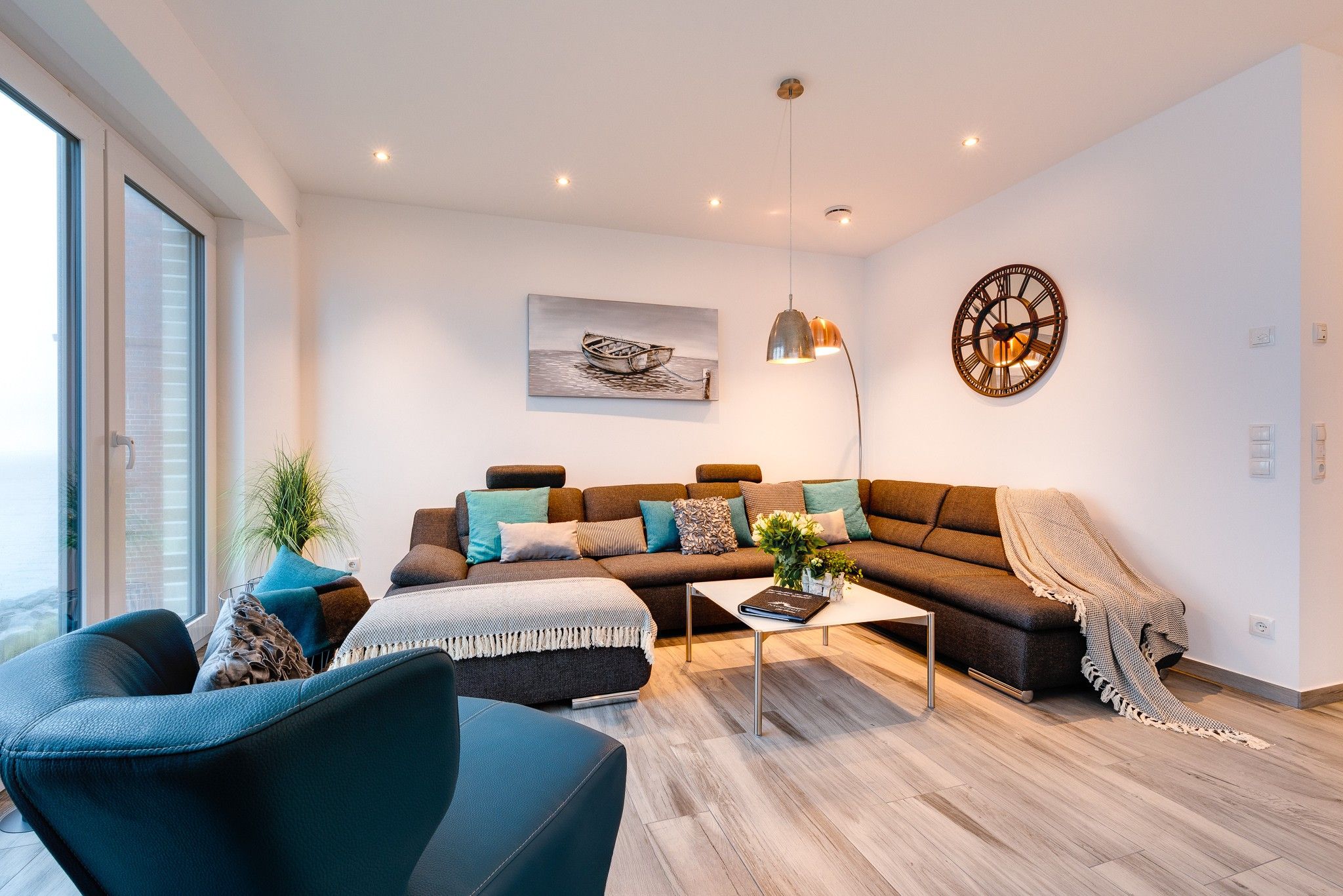 Die modern-maritime Einrichtung, ergänzt durch bodentiefe Fenster, helle Räume und einen Parkettfußboden mit Fußbodenheizung, schafft eine Atmosphäre der Gemütlichkeit und Eleganz. Der offene Küchen- und Essbereich lädt dazu ein, beim Kochen die freie Sicht auf die Ostsee zu genießen.