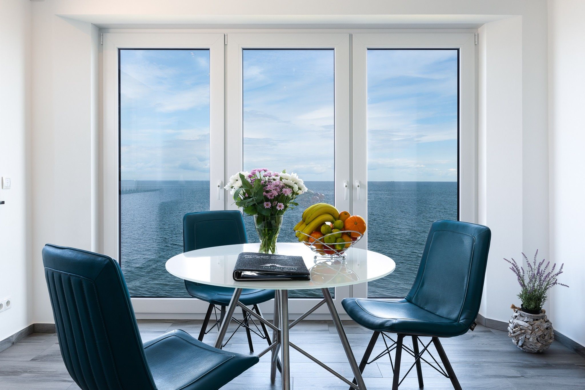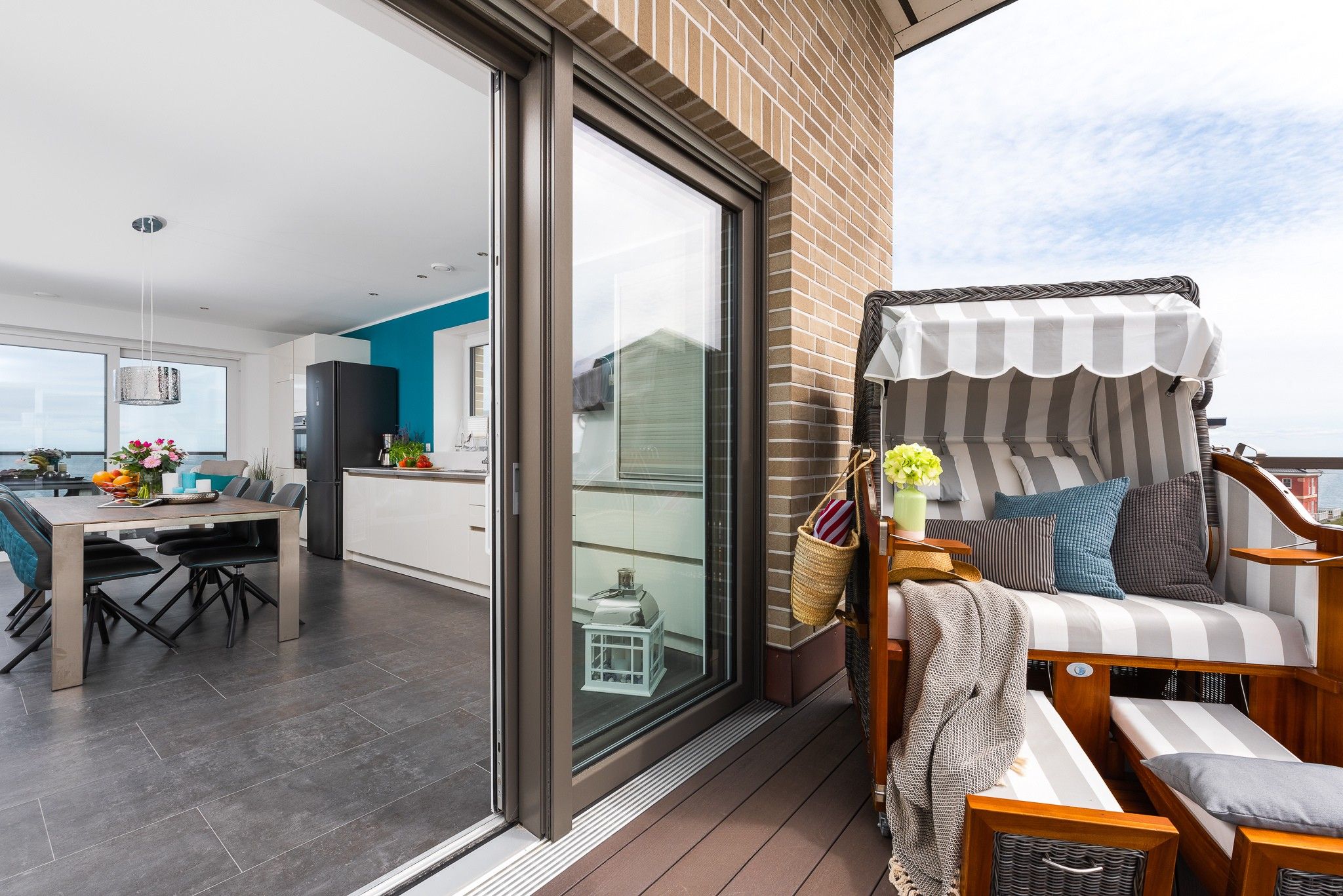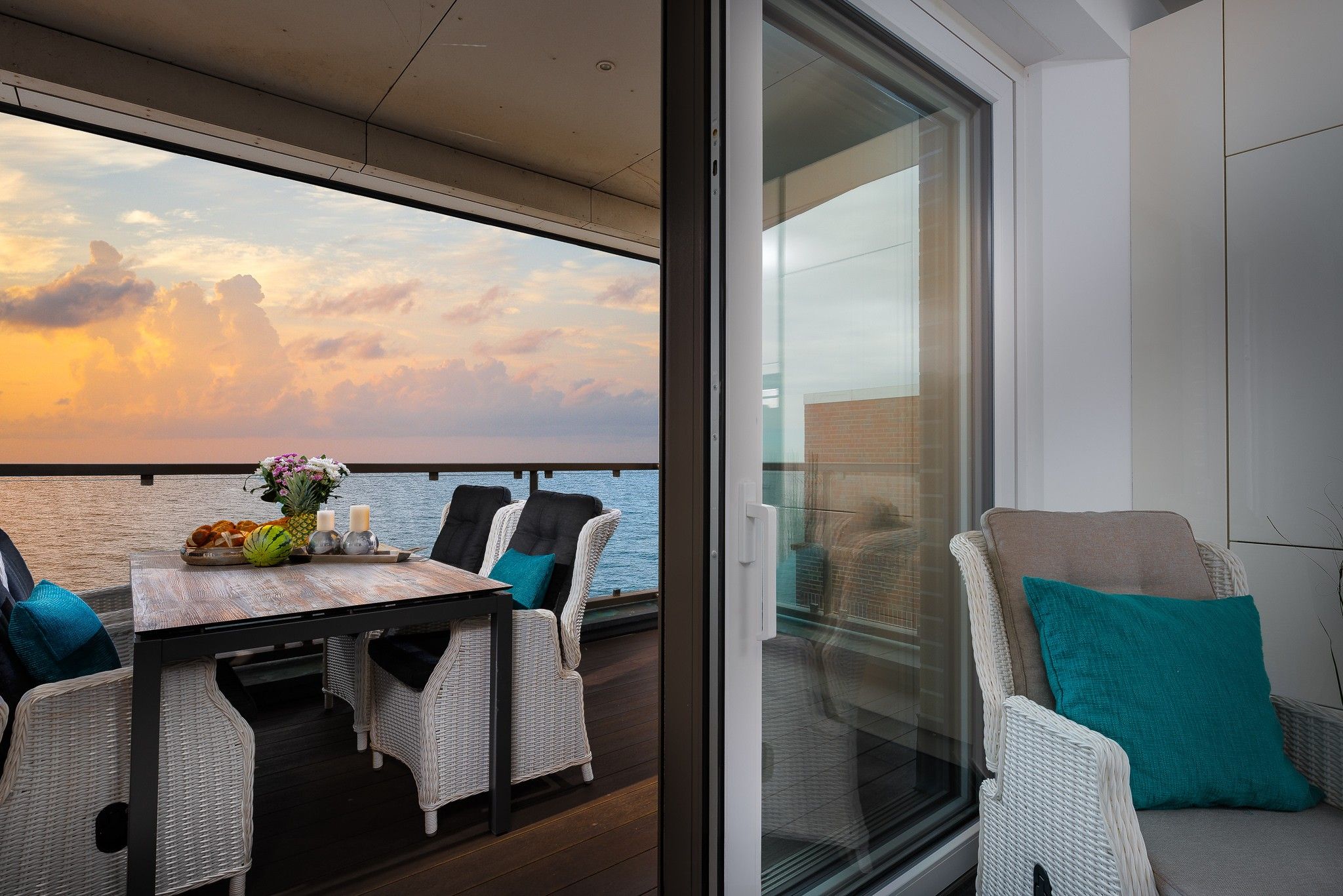 Die Wohnung verfügt über zwei Balkonterrassen, ausgestattet mit komfortablen Sitzmöbeln oder einem Strandkorb. Erleben Sie den atemberaubenden Ostseeblick von einem Balkon und genießen Sie die Abendsonne auf dem anderen.