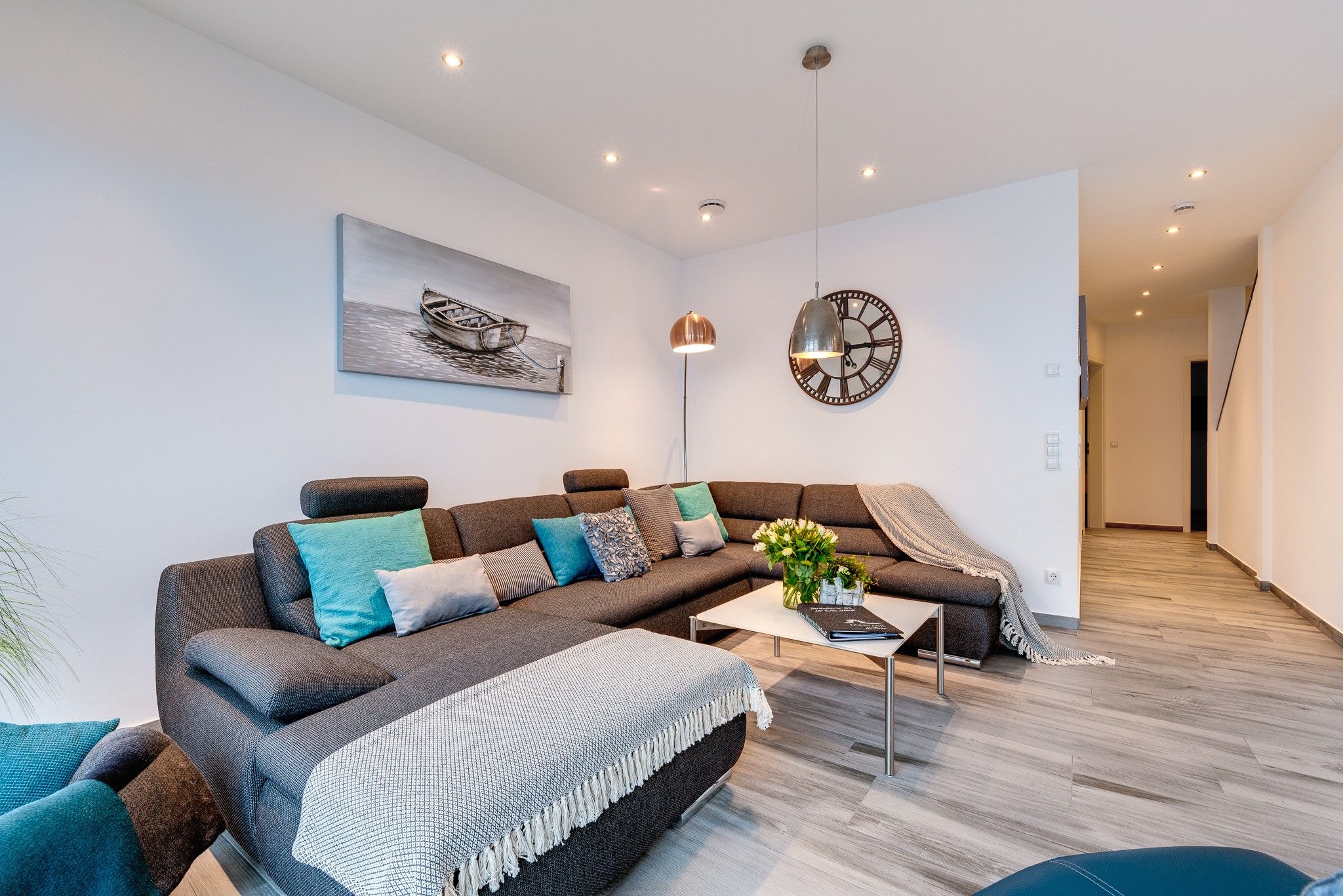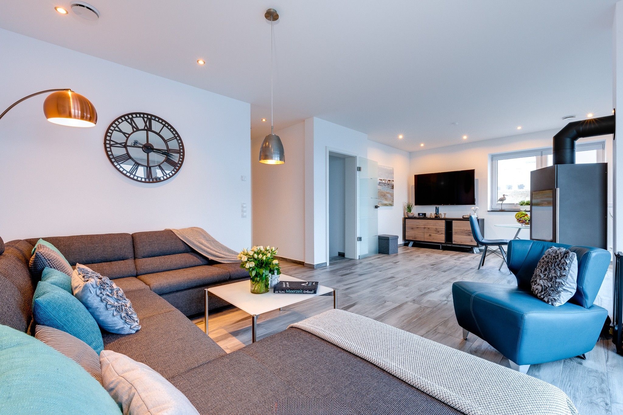 Ergänzt wird Ihr Wohlfühlerlebnis durch einen großzügigen Wohnbereich mit Panoramafenstern, hochwertigen Polstermöbeln, einem Kamin für gemütliche Abende, Smart-TVs und einer hochmodernen technischen Ausstattung, einschließlich einer Raumluftanlage. Zudem wird das gesamte Haus durch regenerative Energie betrieben – ein Plus für umweltbewusste Gäste.