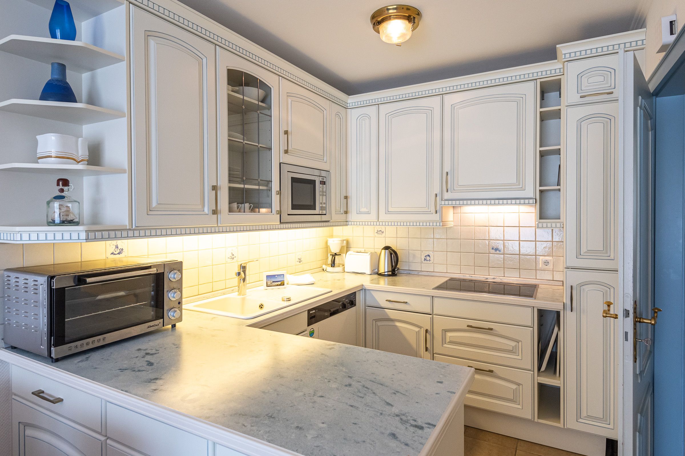 Koch-/Wohn-/Esszimmer: Großer Wohnraum mit schöner Sylter Landhausküche. Der hochwertig möblierte Ess- und Wohnbereich mit TV lädt zum Verweilen ein und führt auf die Südterrasse mit schönem Garten, einem Strandkorb und Gartenmöbeln.