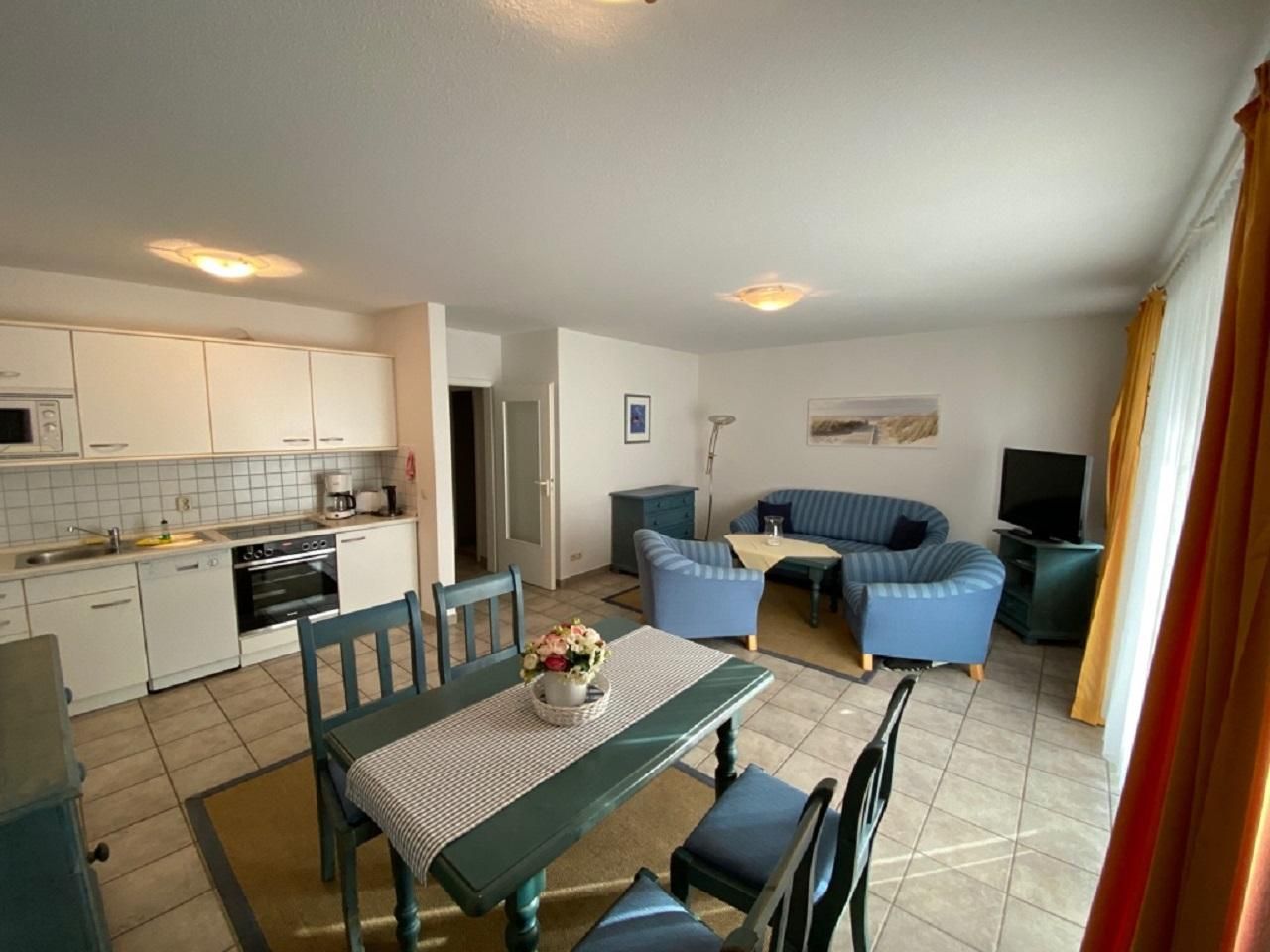 Erdgeschoss mit Terrasse, im offenen Wohnzimmer befindet sich eine Couch mit Schlaffunktion für die 3. und 4. Person, die offene Küchenzeile ist komplett ausgestattet mit (Spülmaschine, Mikrowelle und E-Herd ohne Backofen.)