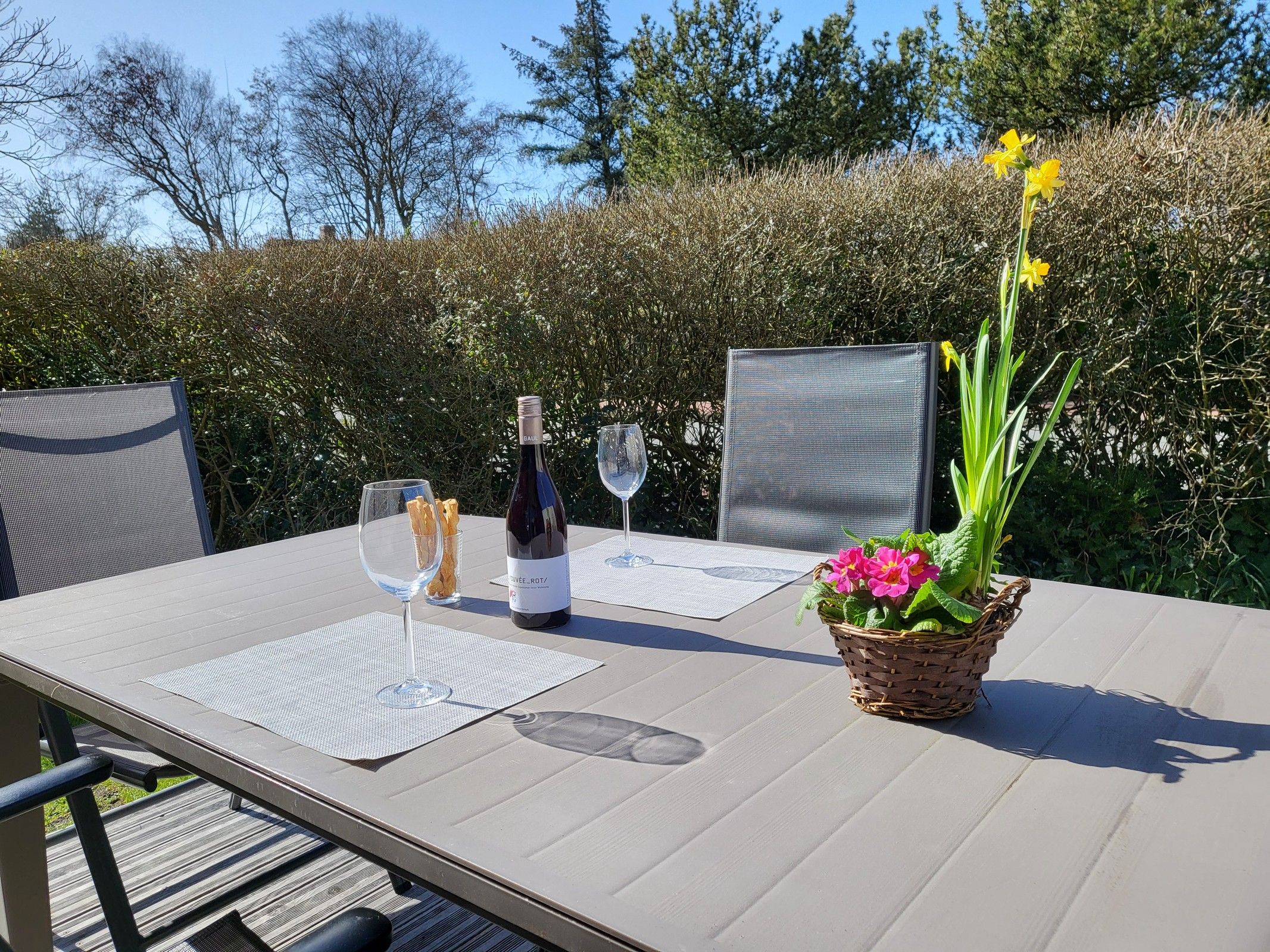Durch den Übergang zur möblierten Terrasse wirkt das geräumige Wohnzimmer wunderbar hell und einladend. Zur Ausstattung gehört hier eine große, edle Ledercouch, die eine tolle Grundlage für entspannte Stunden bietet. Für die multimediale Unterhaltung sorgen Flachbild-TV mit DVD-Player sowie Musikanlage und kostenfreies W-LAN. In den Raum integriert liegt die gut ausgestattete Küche des Ferienhauses, hier stehen unter anderem Cerankochfeld und Backofen sowie Kühlschrank mit Gefrierfach, ein Geschirrspüler sowie Kaffeemaschine zur Verfügung. Am angrenzenden Esstisch ist Platz für die ganze Familie. Eine Senseo-Kaffeepad-Maschine ist ebenfalls vorhanden.