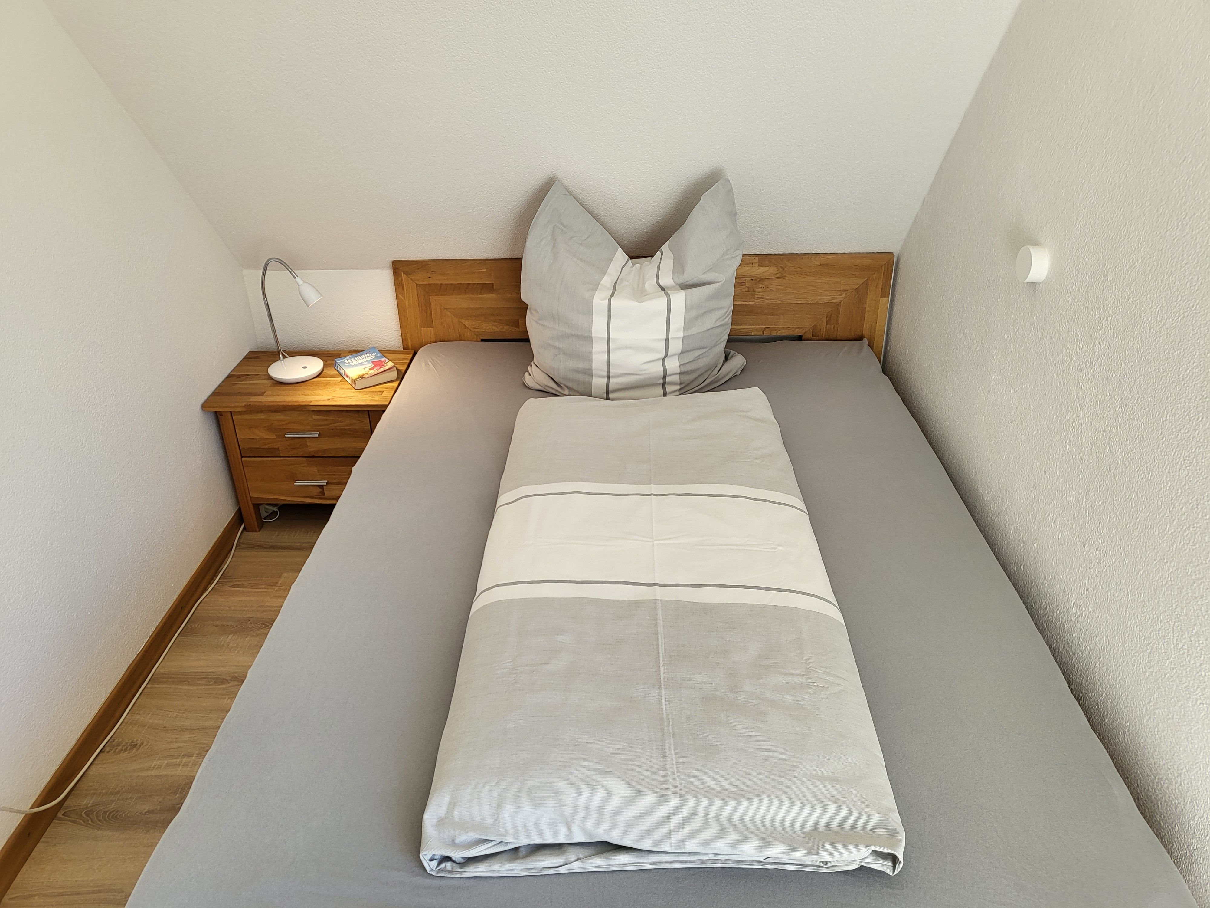 Ebenfalls im Erdgeschoss untergebracht ist ein Schlafzimmer mit komfortablem 140x200cm Doppelbett sowie ein Duschbad mit WC. Das Obergeschoss ist ausgestattet mit zwei weiteren Schlafzimmern. Eines verfügt über ein 140x200cm Doppelbett, ein weiteres ist mit einem 160x200cm Doppelbett ausgestattet. Das große Schlafzimmer verfügt über Zugang zum Balkon und ist zudem ausgestattet mit einem eigenen Flachbild-TV. Weiterhin ist ein geräumiges Badezimmer mit Badewanne und WC auf der Etage untergebracht.