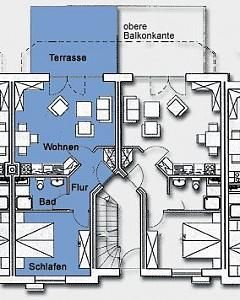 Das liebevoll eingerichtete ca. 50 qm große 2-Zimmer-Appartement befindet sich im 1. Obergeschoss zur Sonnenseite. Es hat einen schönen großen Balkon, einen hellen, sonnendurchfluteten Wohnraum mit Fliesenboden und einem Polstersofa, welches auch als Schlafsofa umwandelbar ist. Daneben zwei Sessel, ein Couchtisch, ein Flatscreen-TV, sowie eine moderne, integrierte Einbauküche mit Geschirrspüler und Mikrowelle, direkt daneben befindet sich ein gemütlicher Essbereich. Im Schlafraum steht ein Doppelbett (2 x 90iger Matratzen) mit einem Nachttisch und ein großer Kleiderschrank mit ausreichendem Stauraum. Im Eingangsbereich befindet sich die Garderobe. Das Duschbad ist hell gefliest und verfügt über eine Eckdusche, WC und einen Handtuchwärmer. Für die kleinen Gäste steht ein Reisebett und ein Hochstuhl zur Verfügung.