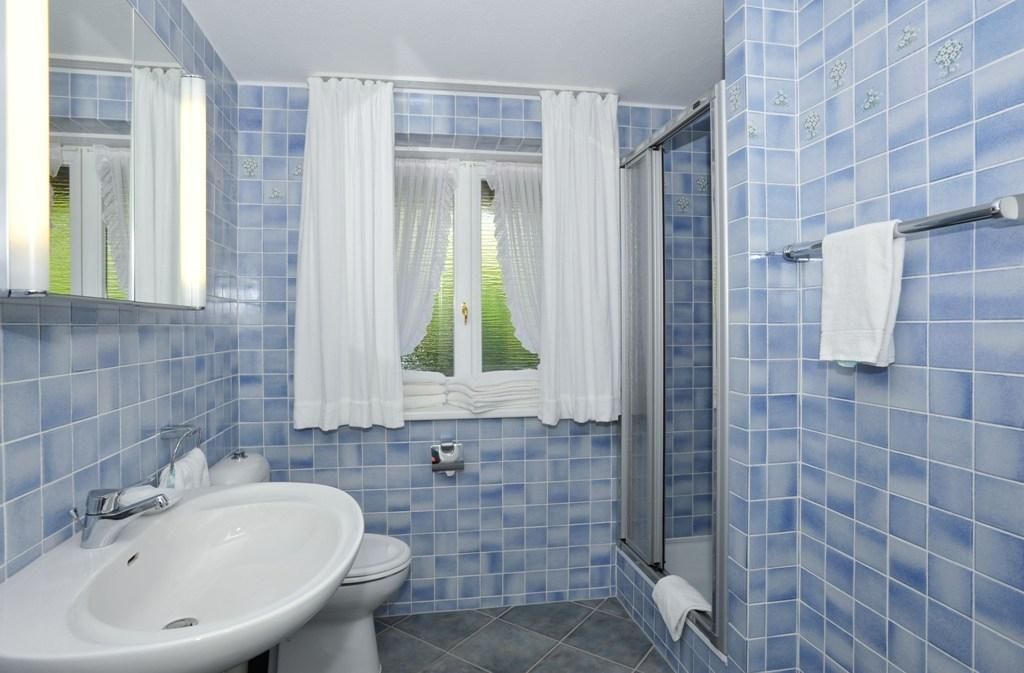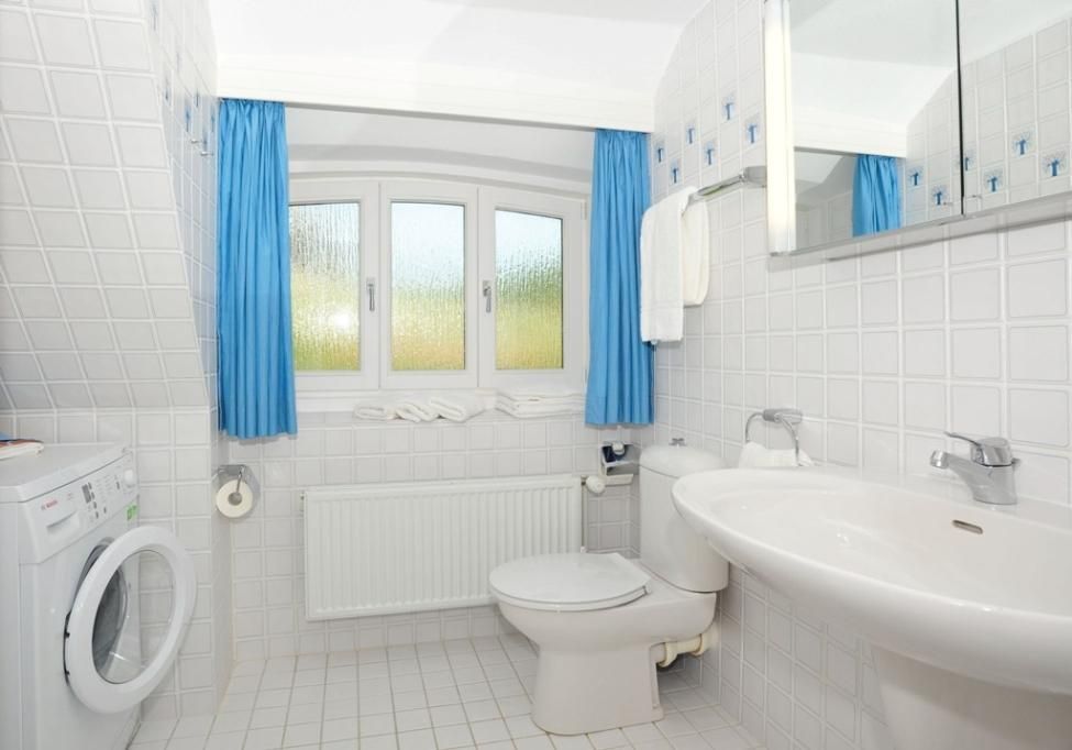 Zwei Badezimmer sorgen für Komfort und Wohlgefühl: Ein maritim blau gefliestes Badezimmer mit Dusche und Tageslicht, das für echtes Sylt-Flair sorgt, und ein weiteres Badezimmer mit Dusche, WC, Fön und Waschmaschine.