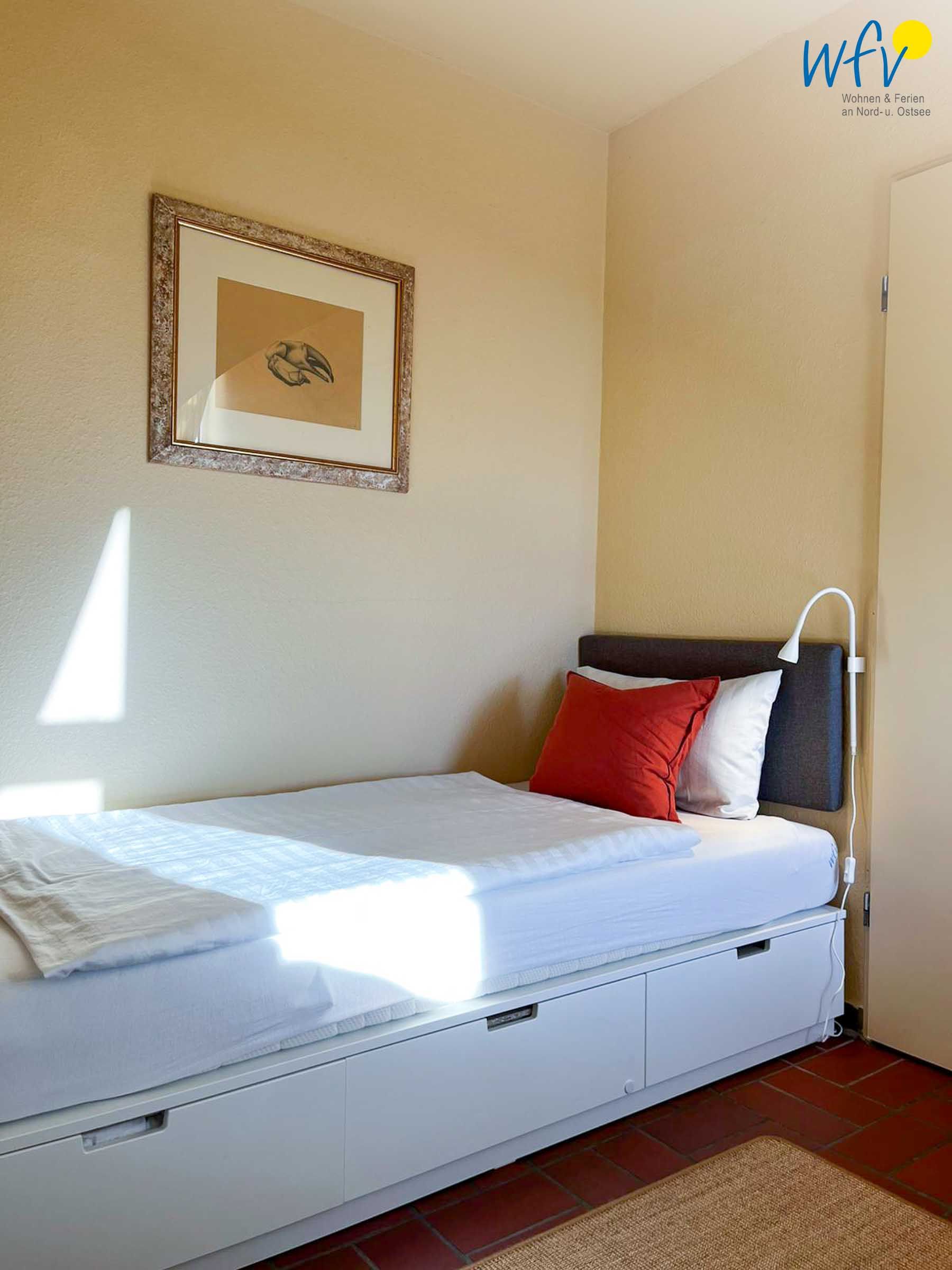 Das freundliche und kürzlich renovierte Schlafzimmer (2026) ist mit zwei komfortablen Einzelbetten eingerichtet (0,90 x 200 cm). Für Ihre Urlaubsgarderobe gibt es eine Kommode und eine Weitere im Flur. Kleidungsstücke, die aufgehängt werden, finden an der Leiter und an den Haken hinter der Tür Platz.