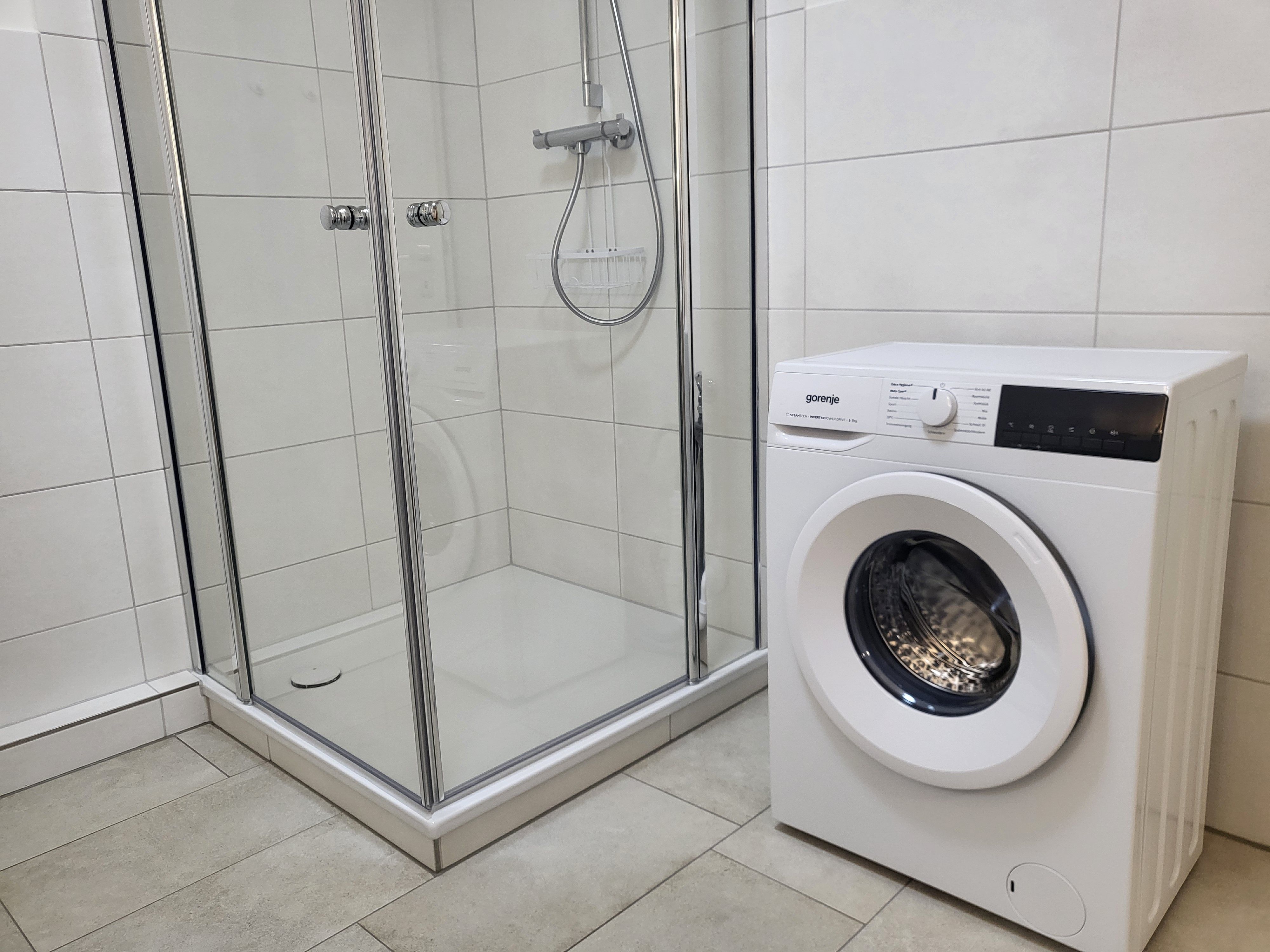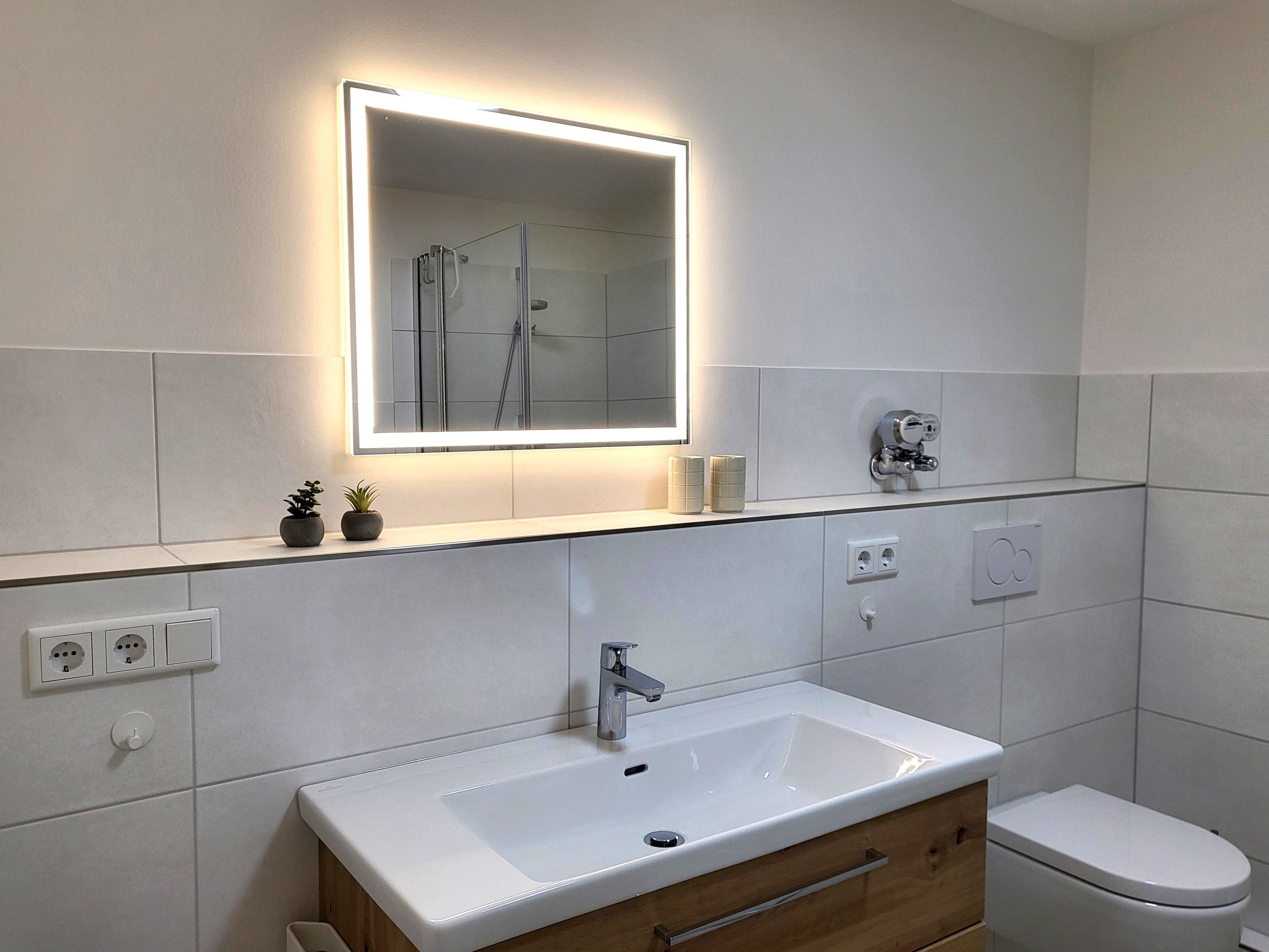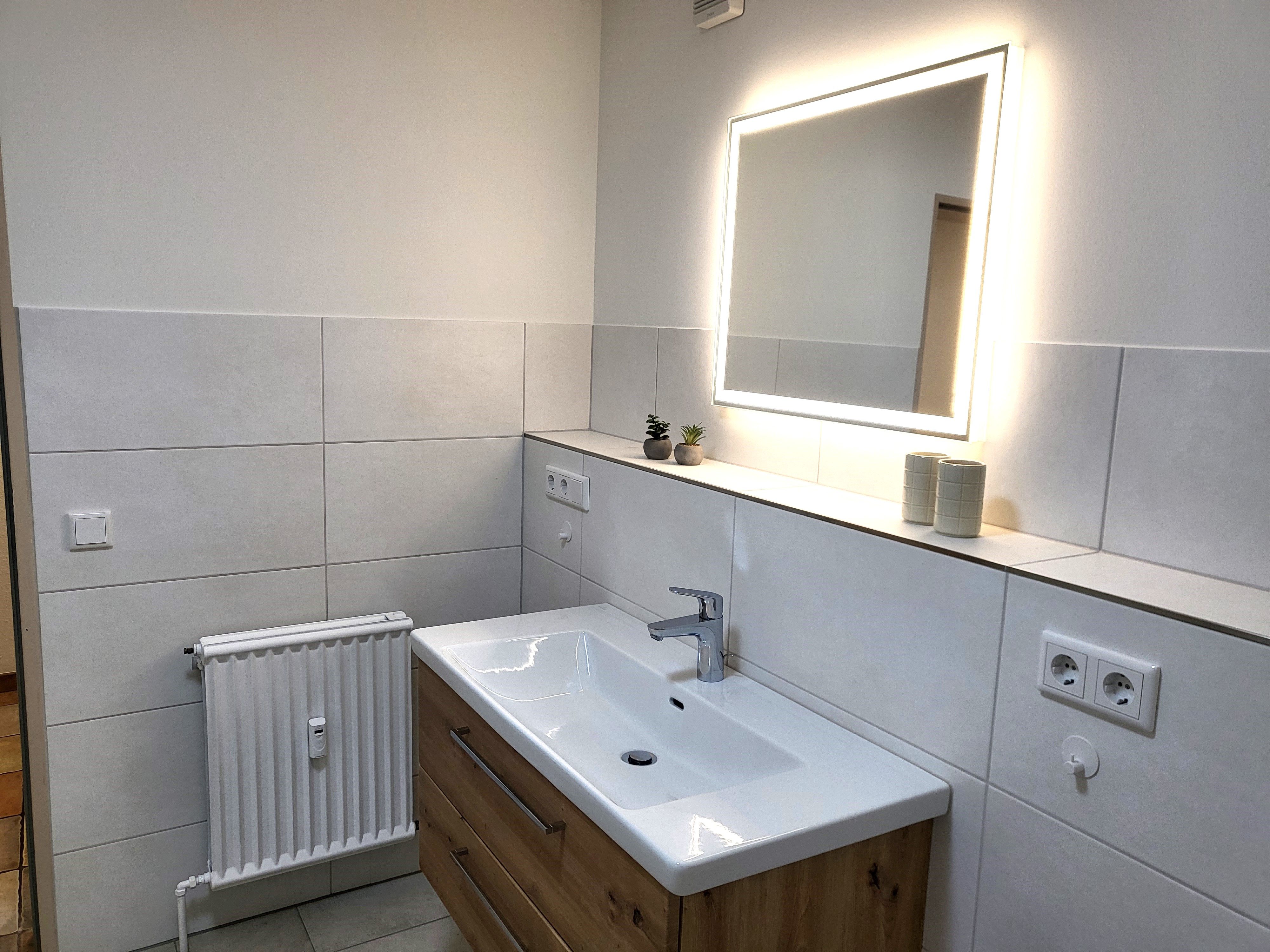 Das großzügige, neu sanierte Badezimmer verfügt über einen großen Spiegel, sowie einer großen Dusche (ca. 1 x 1m), Fön und Waschmaschine.