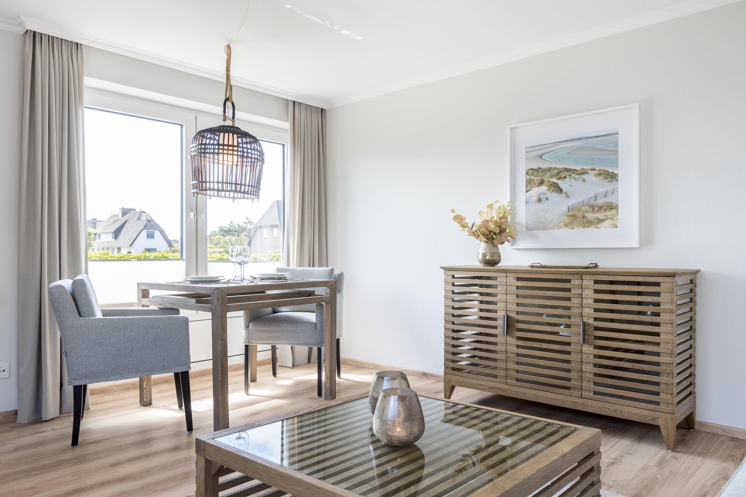 Wohn-/Essbereich: Heller, moderner Wohnbereich mit Sofaecke, TV und einem Esstisch am Fenster mit Platz für 2 Personen. Von hier gelangen Sie auch auf die schöne Ost-Terrasse.