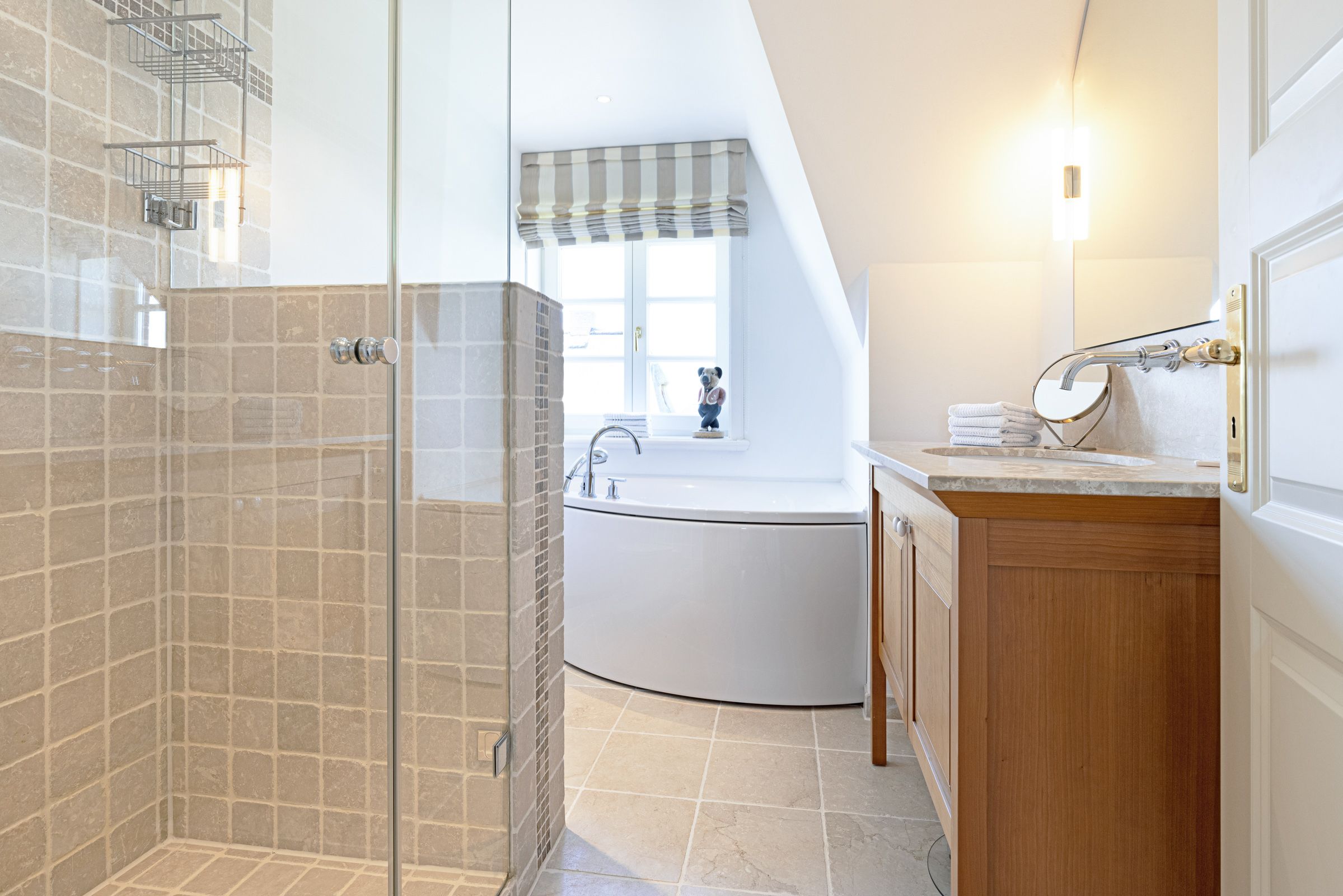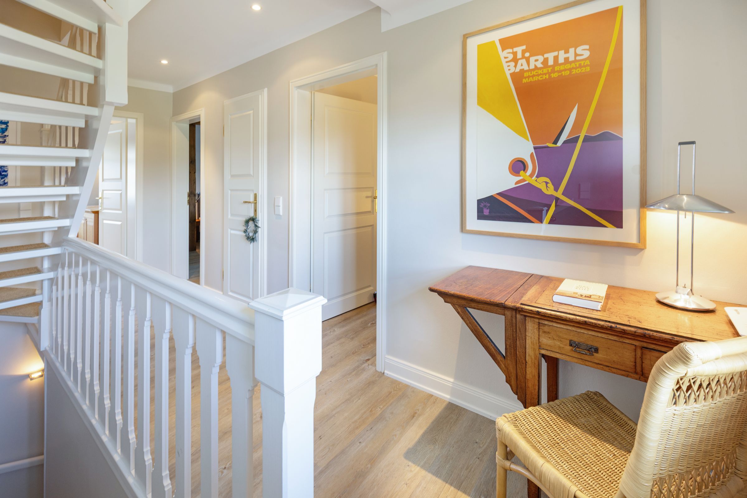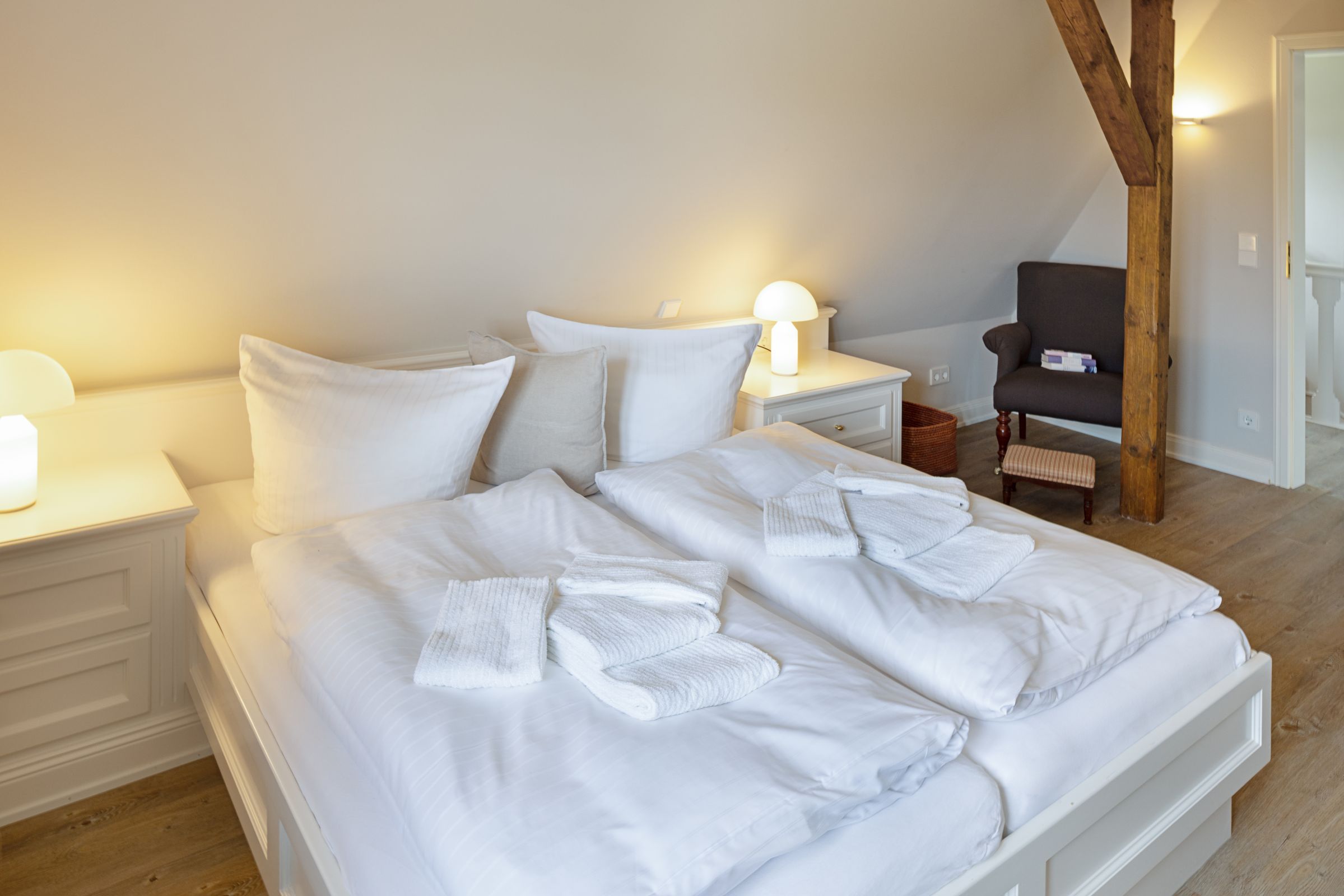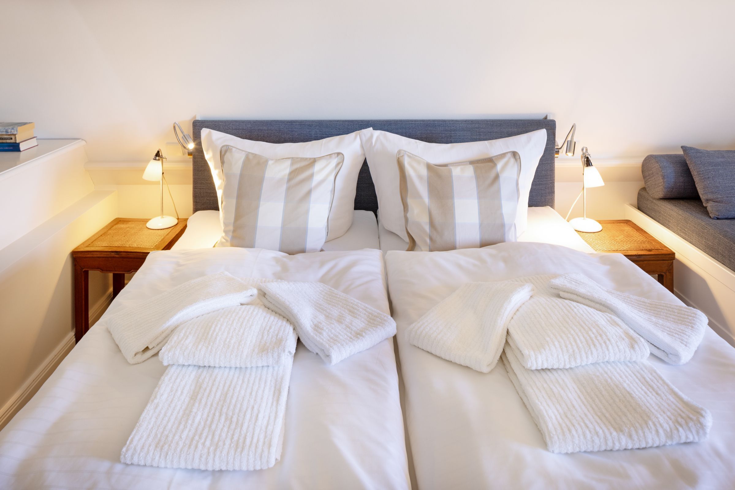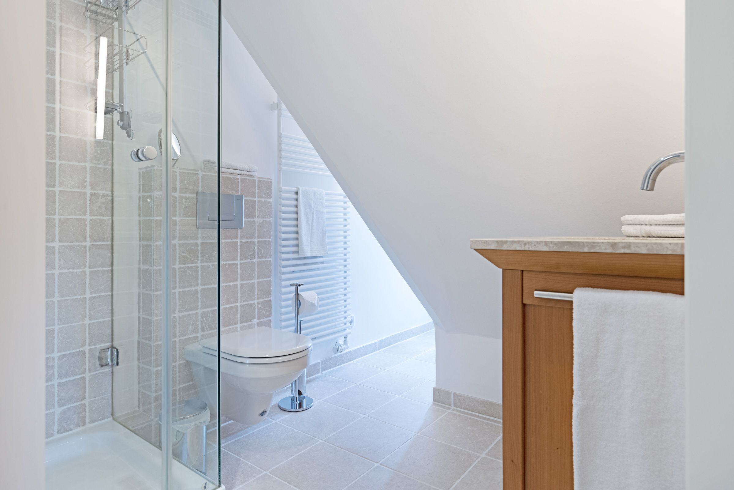 Im EG befindet sich ein Gäste-WC. Im ersten Stock befinden sich zwei Schlafzimmer – eines mit Doppelbett, eines mit Doppelbett und einem Einzelbett/Couch und ein Badezimmer mit Dusche und Wanne. Im Dachgeschoss befindet sich noch ein weiteres Schlafzimmer, ebenfalls mit zwei Einzelbetten. Auch hier finden Sie ein Badezimmer mit einer Dusche.
