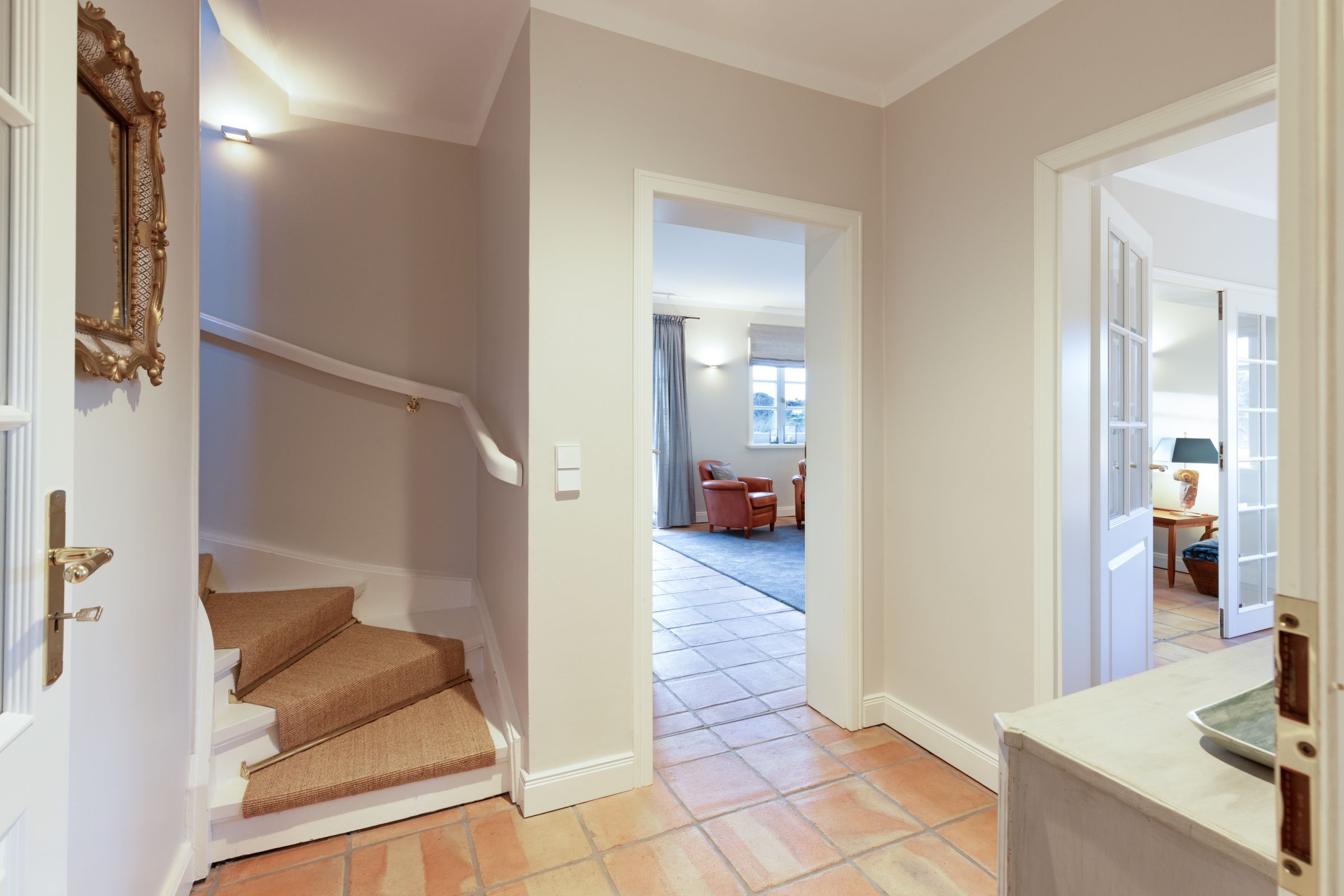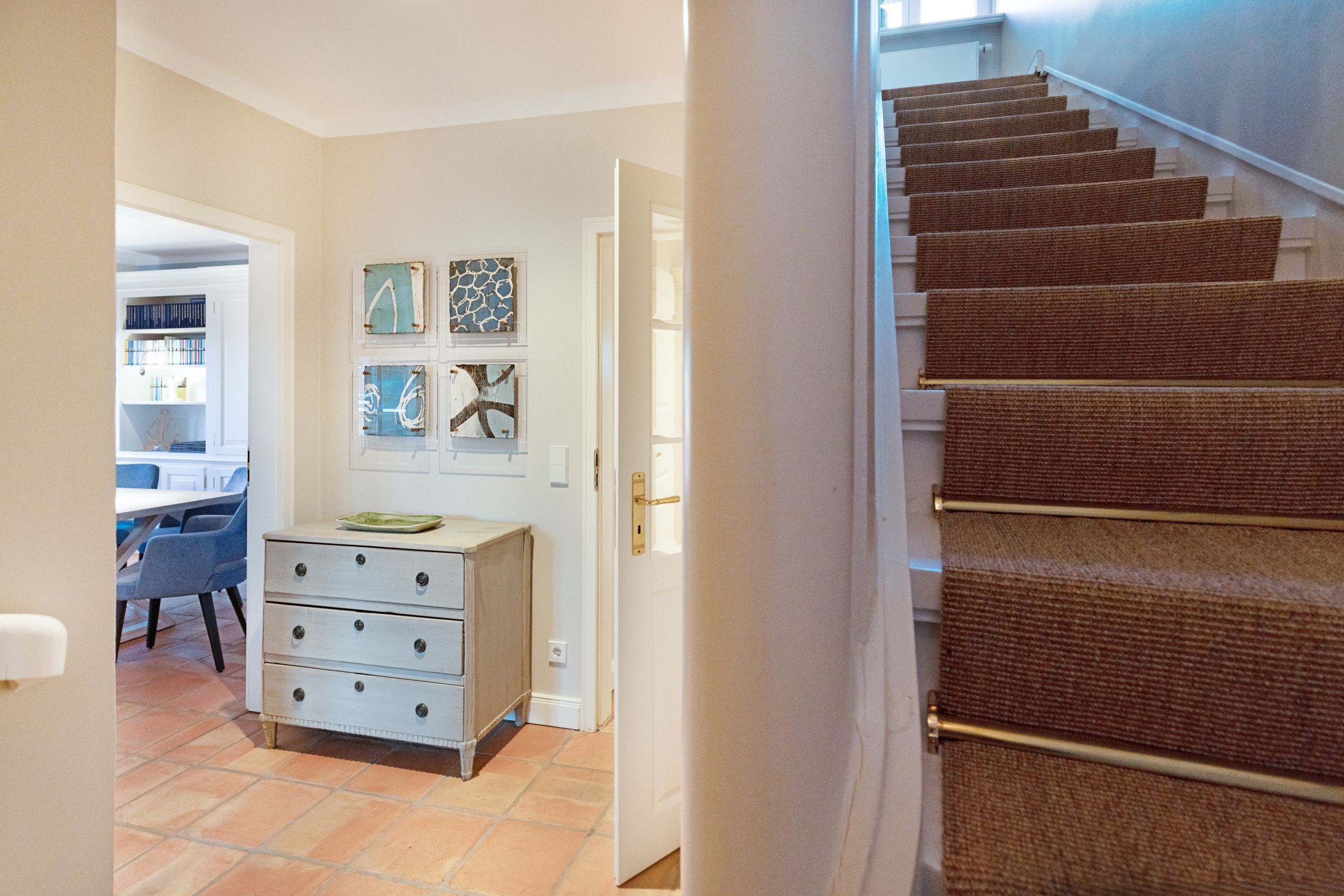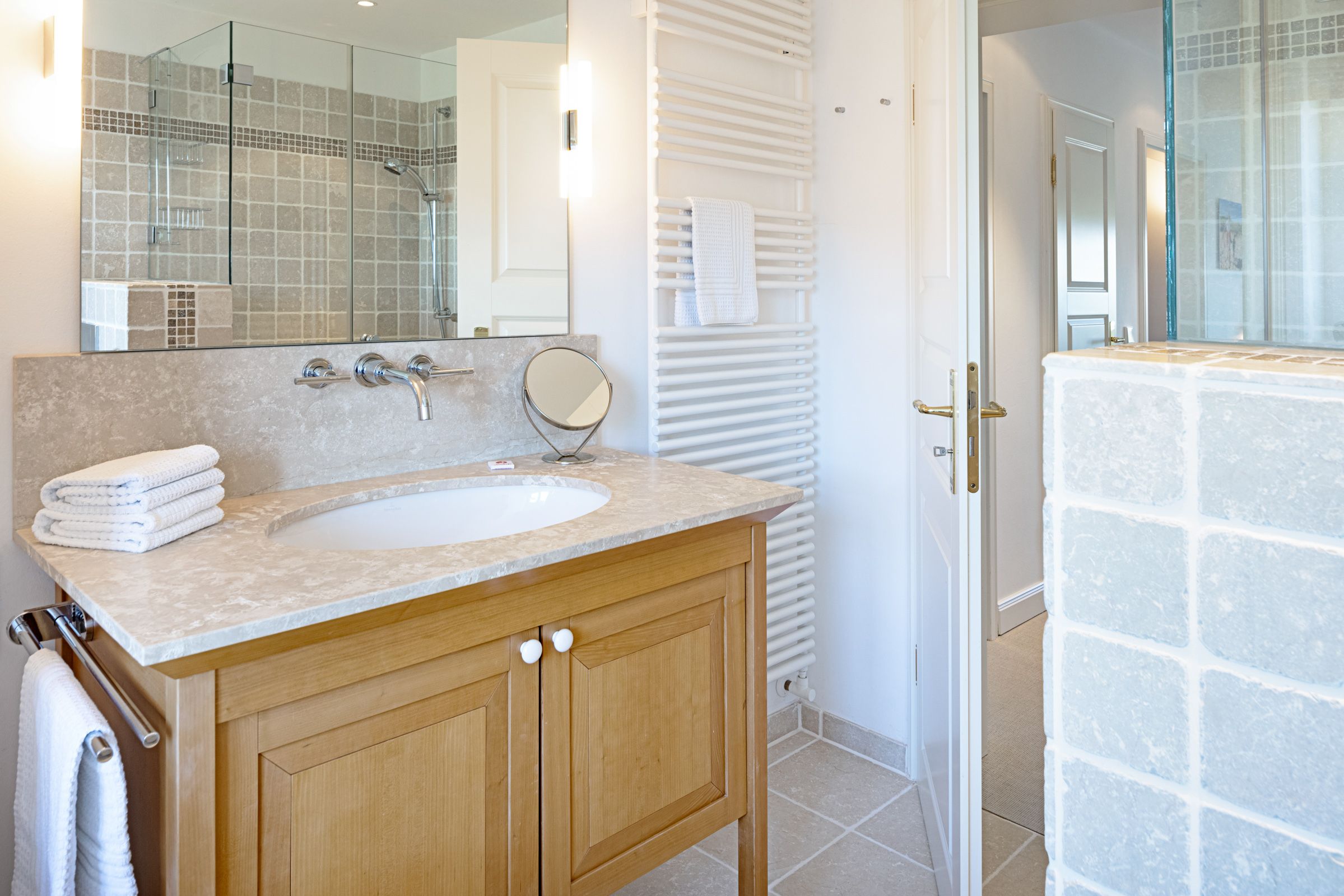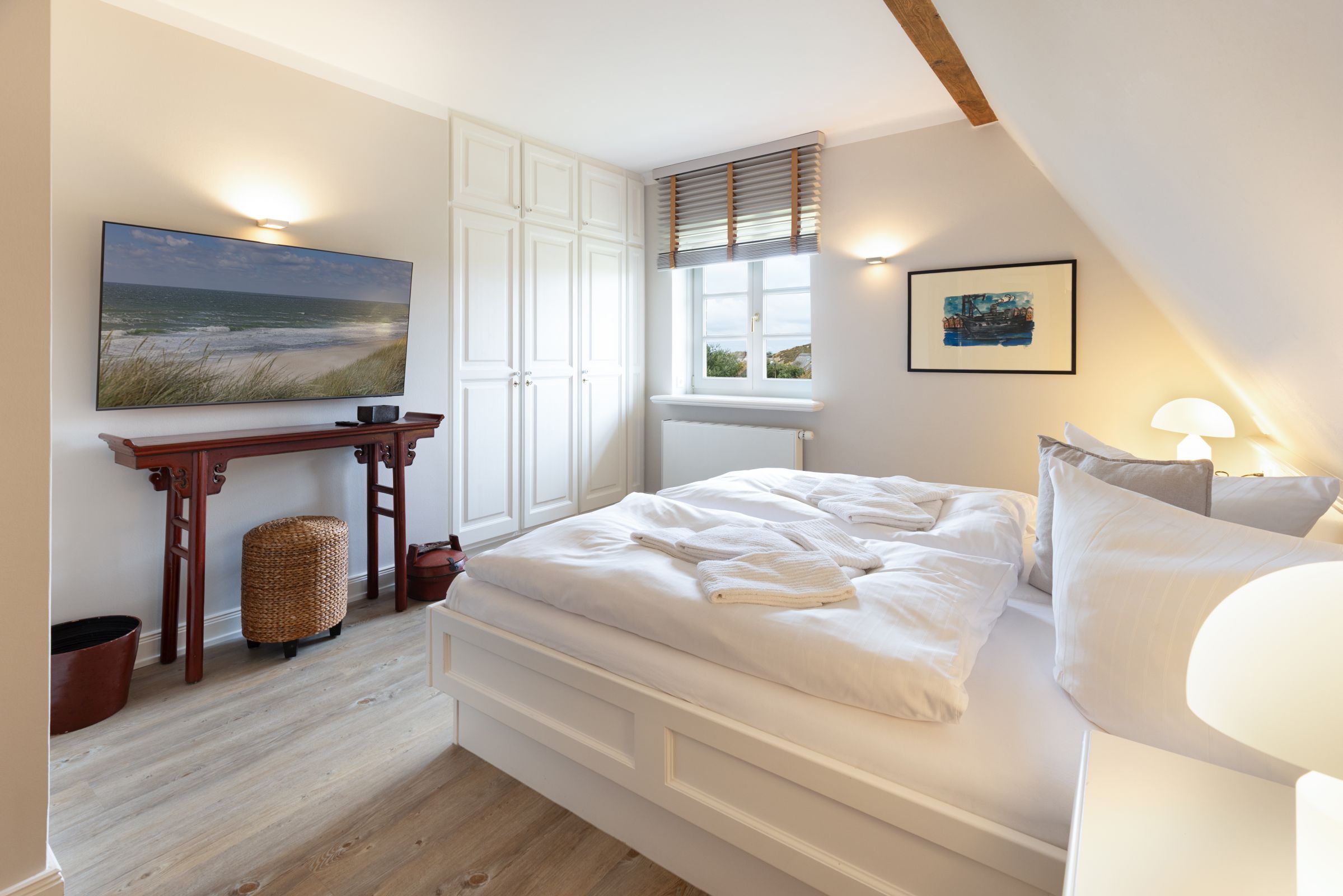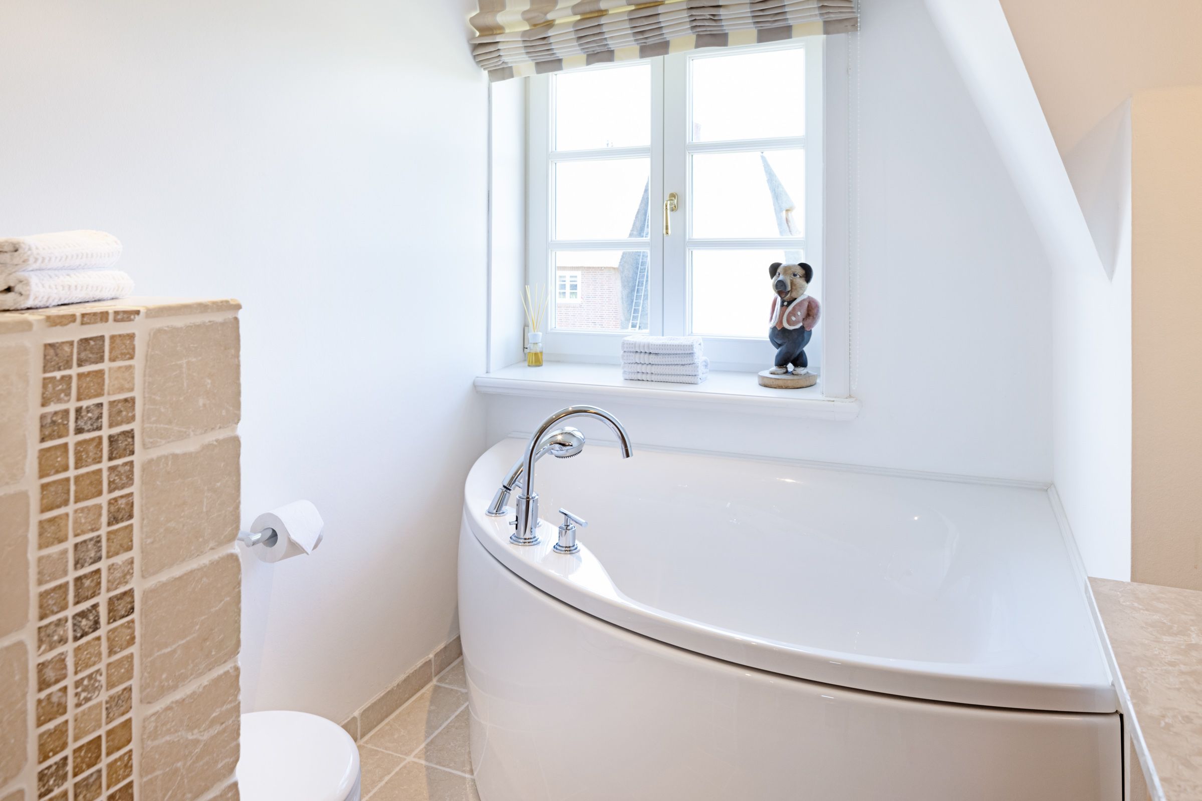 Im EG befindet sich ein Gäste-WC. Im ersten Stock befinden sich zwei Schlafzimmer – eines mit Doppelbett, eines mit Doppelbett und einem Einzelbett/Couch und ein Badezimmer mit Dusche und Wanne. Im Dachgeschoss befindet sich noch ein weiteres Schlafzimmer, ebenfalls mit zwei Einzelbetten. Auch hier finden Sie ein Badezimmer mit einer Dusche.