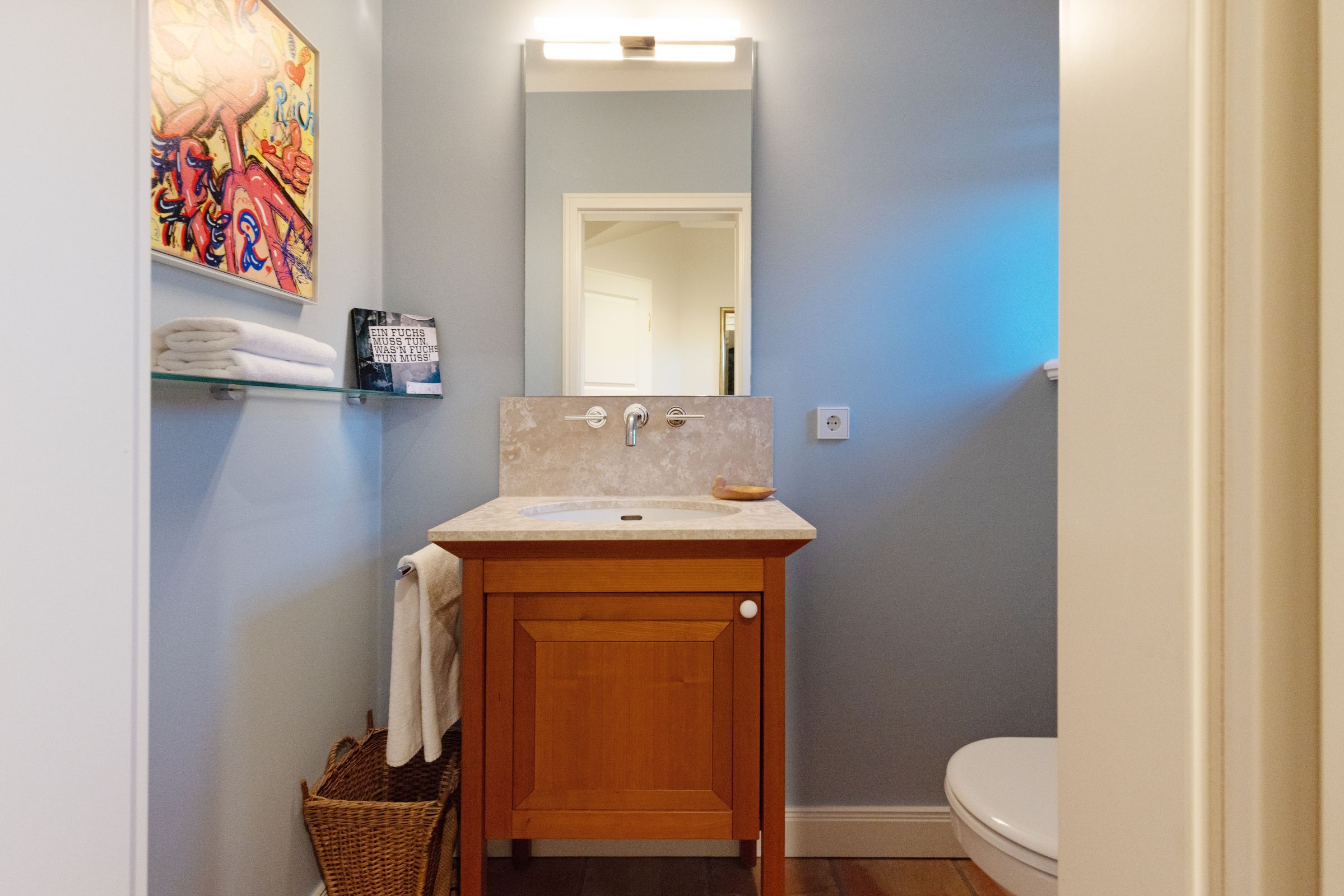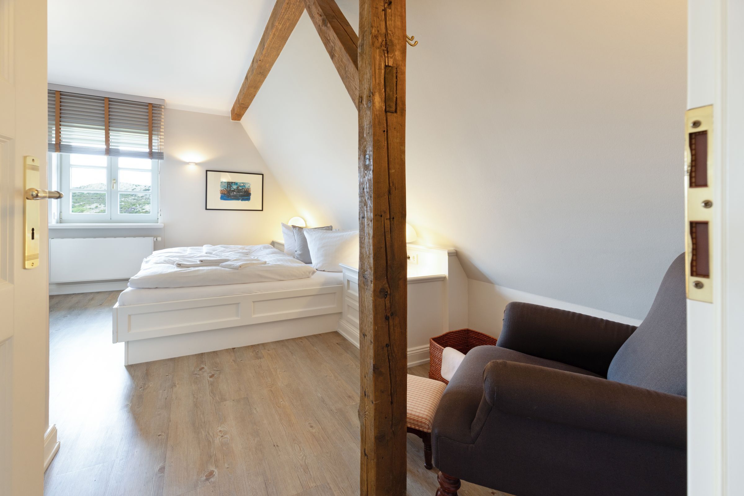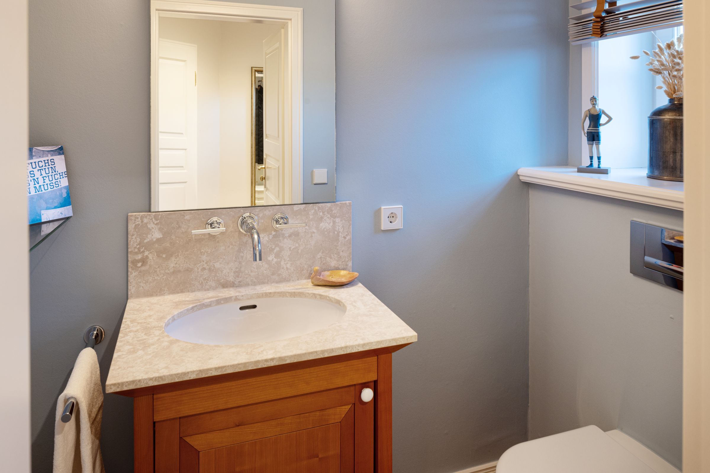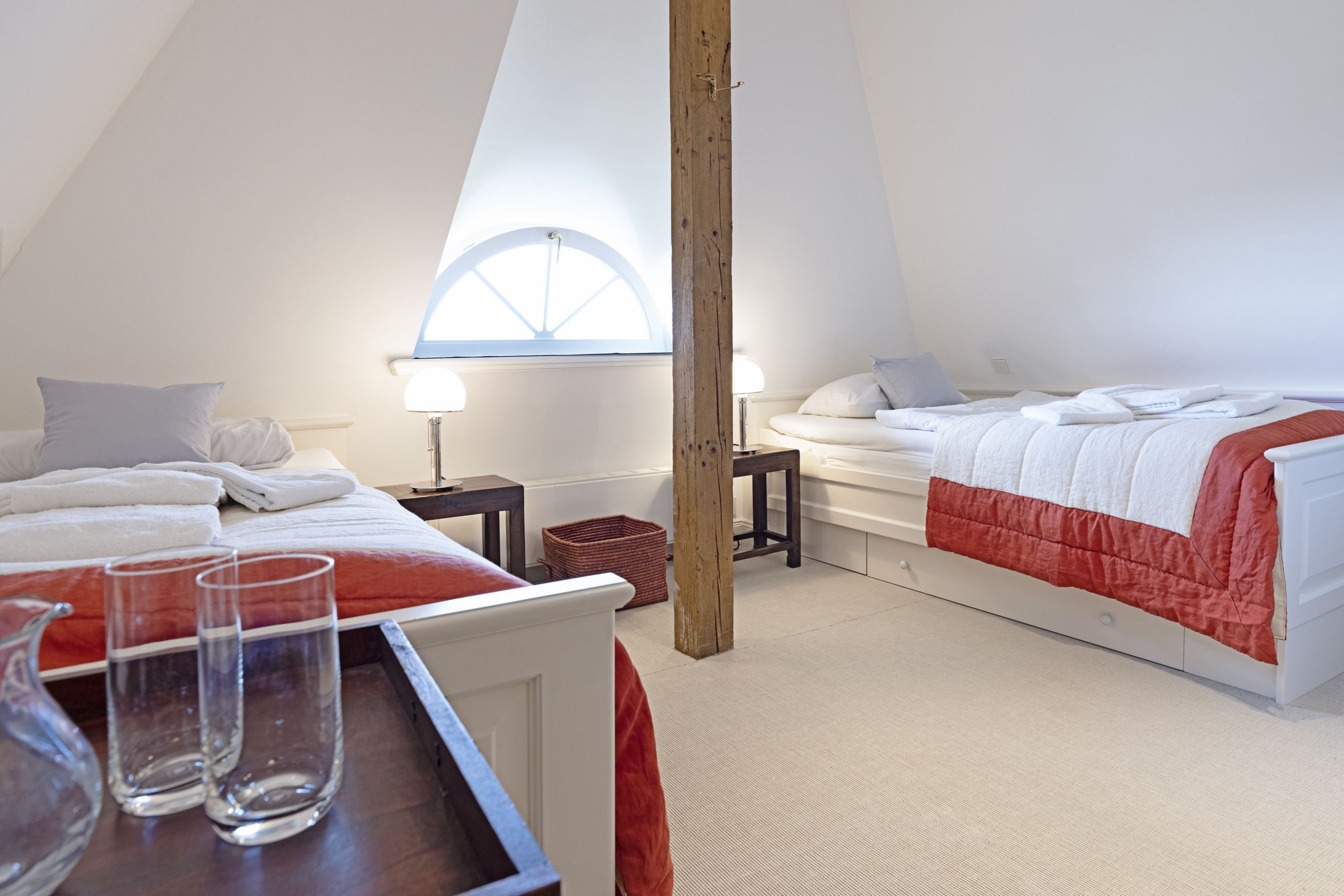 Im EG befindet sich ein Gäste-WC. Im ersten Stock befinden sich zwei Schlafzimmer – eines mit Doppelbett, eines mit Doppelbett und einem Einzelbett/Couch und ein Badezimmer mit Dusche und Wanne. Im Dachgeschoss befindet sich noch ein weiteres Schlafzimmer, ebenfalls mit zwei Einzelbetten. Auch hier finden Sie ein Badezimmer mit einer Dusche.