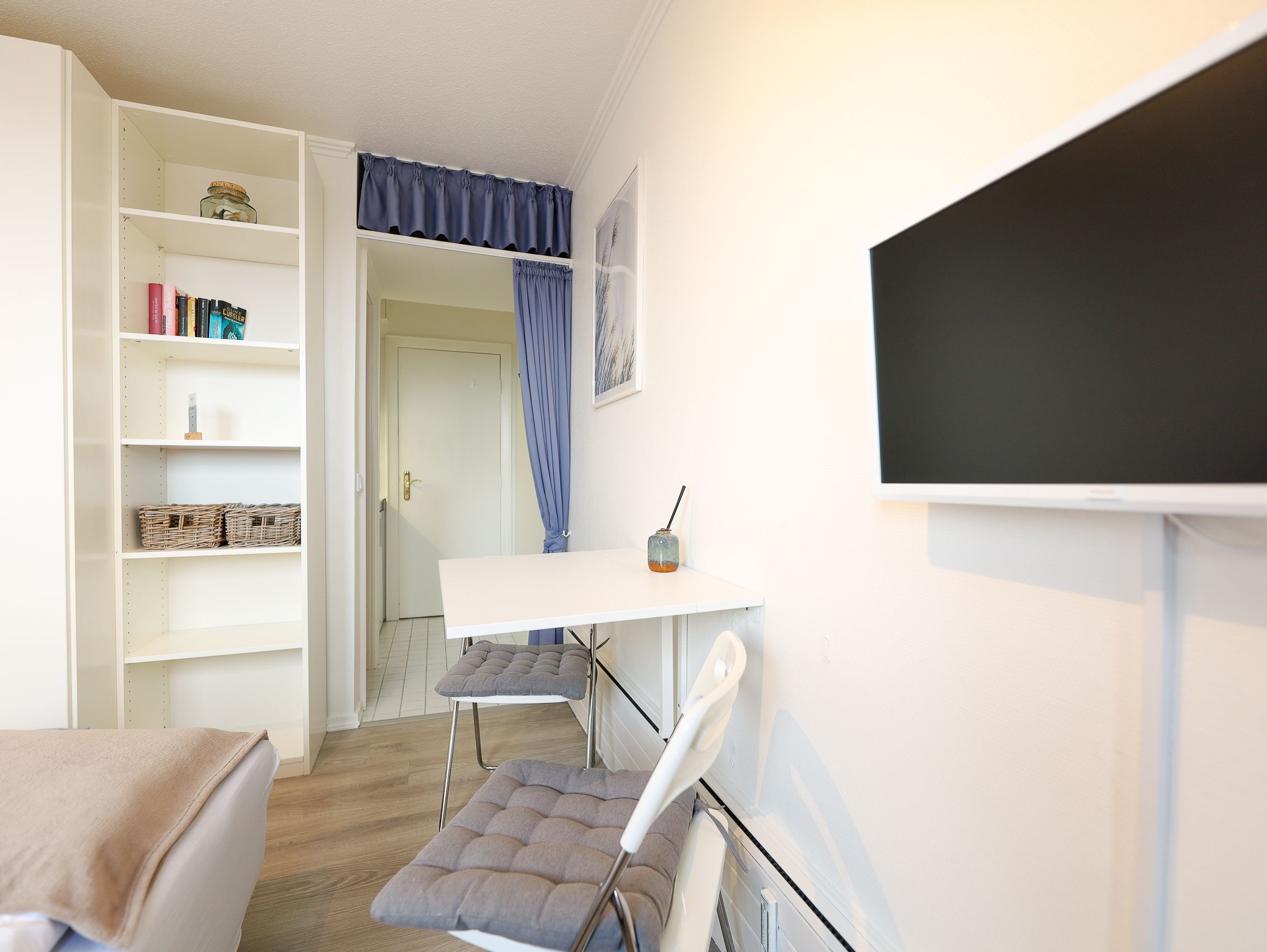 Hier wurde aus jedem Winkel das Beste herausgeholt und so ist ein hyggeliges Wohlfühldomizil entstanden. Der in frischen Farben gehaltene Wohn- und Schlafbereich punktet mit einer hochwertigen Couch, die sich ruckzuck in ein bequemes Doppelbett (Liegefläche 1,50m) verwandeln lässt. Die Pantryküche ist bestens ausgestattet und auch in dem modernen Duschbad fehlt es an nichts. Das perfekte kleine Nest für eine Auszeit auf Sylt!