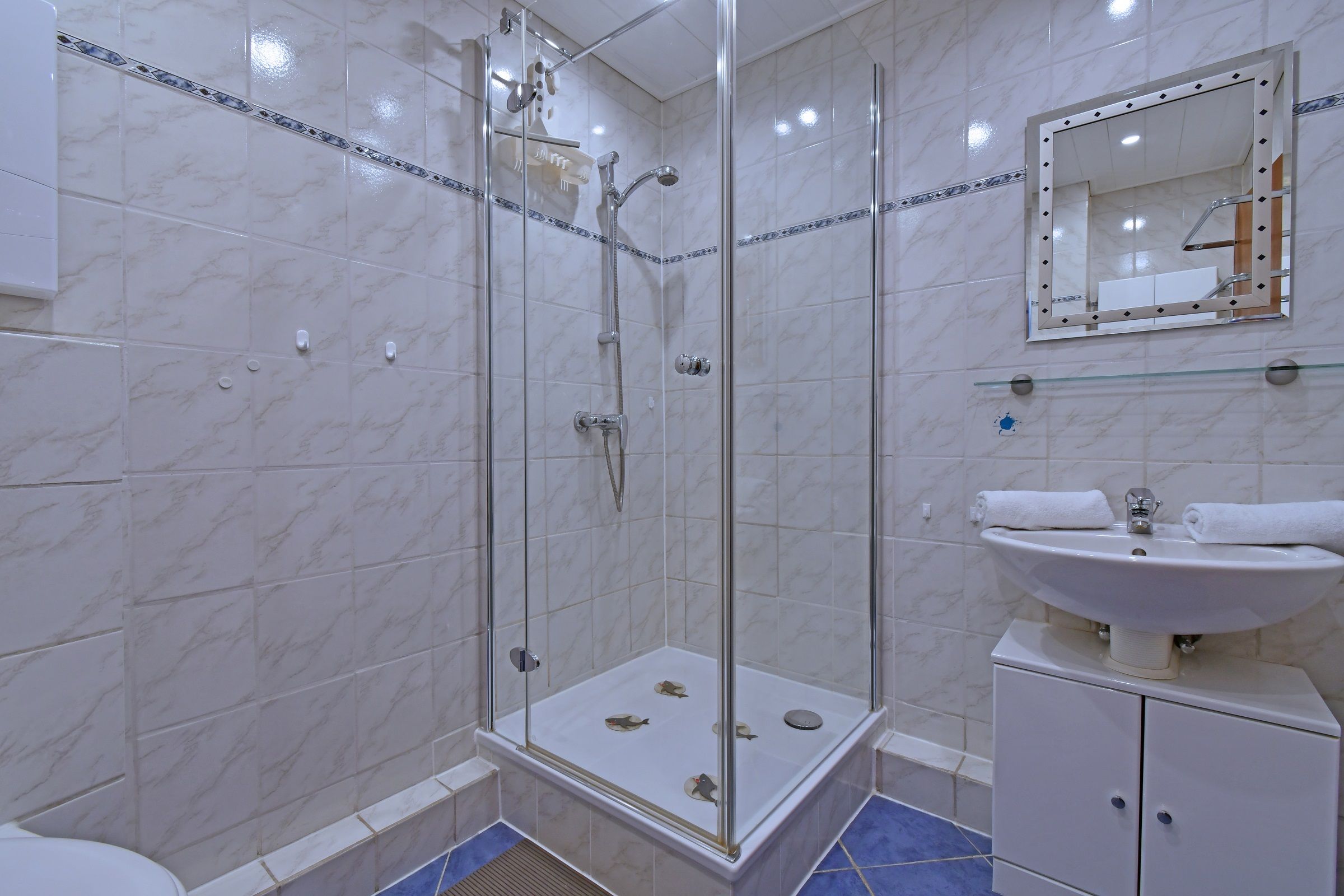 Das Duschbad ist hell und freundlich gefliest und verfügt über eine Eckdusche Waschtisch und einem Hänge-WC.