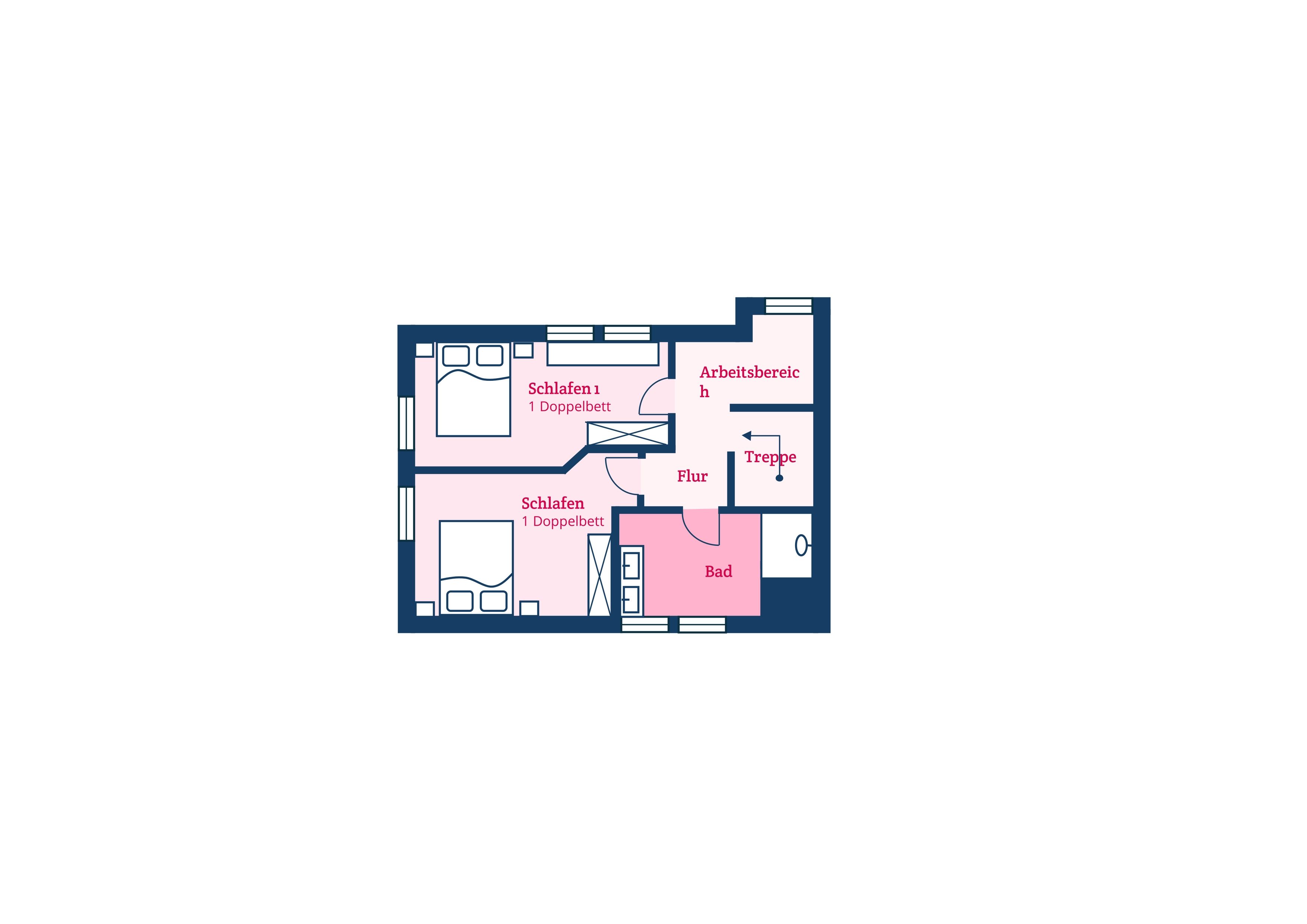 Im Obergeschoss sind die beiden Schlafzimmer mit je einem Doppelbett - davon 1 Boxspringbett -, ein Duschbad sowie ein Lese- und Arbeitsbereich im Flur gelegen.