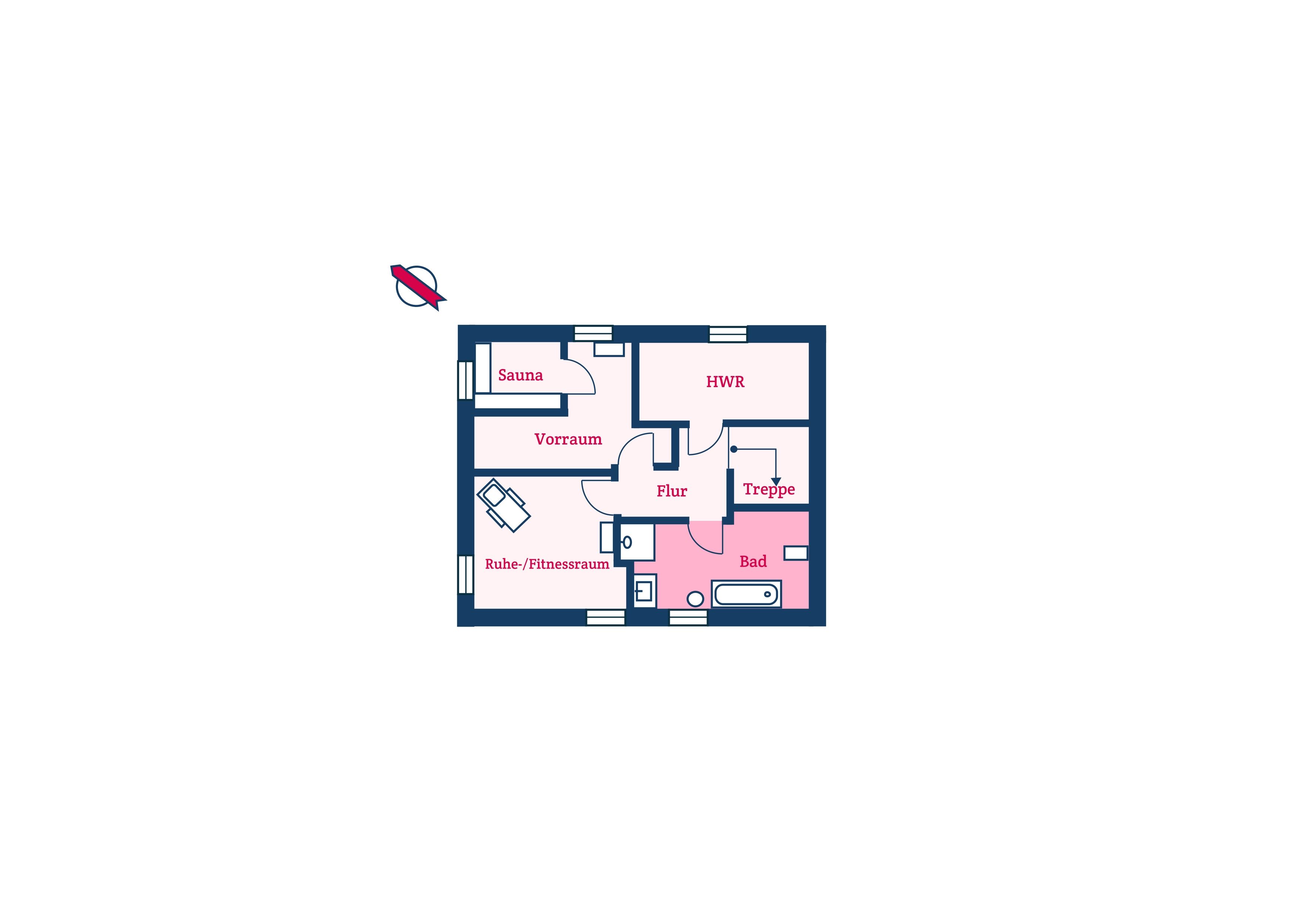 Im Souterrain stehen Ihnen eine Finnische Sauna/Dampfsauna sowie ein Ruhe-/Fitnessraum, ein Vollbad und ein Hauswirtschaftsraum mit Waschmaschine und Trockner zur Verfügung.