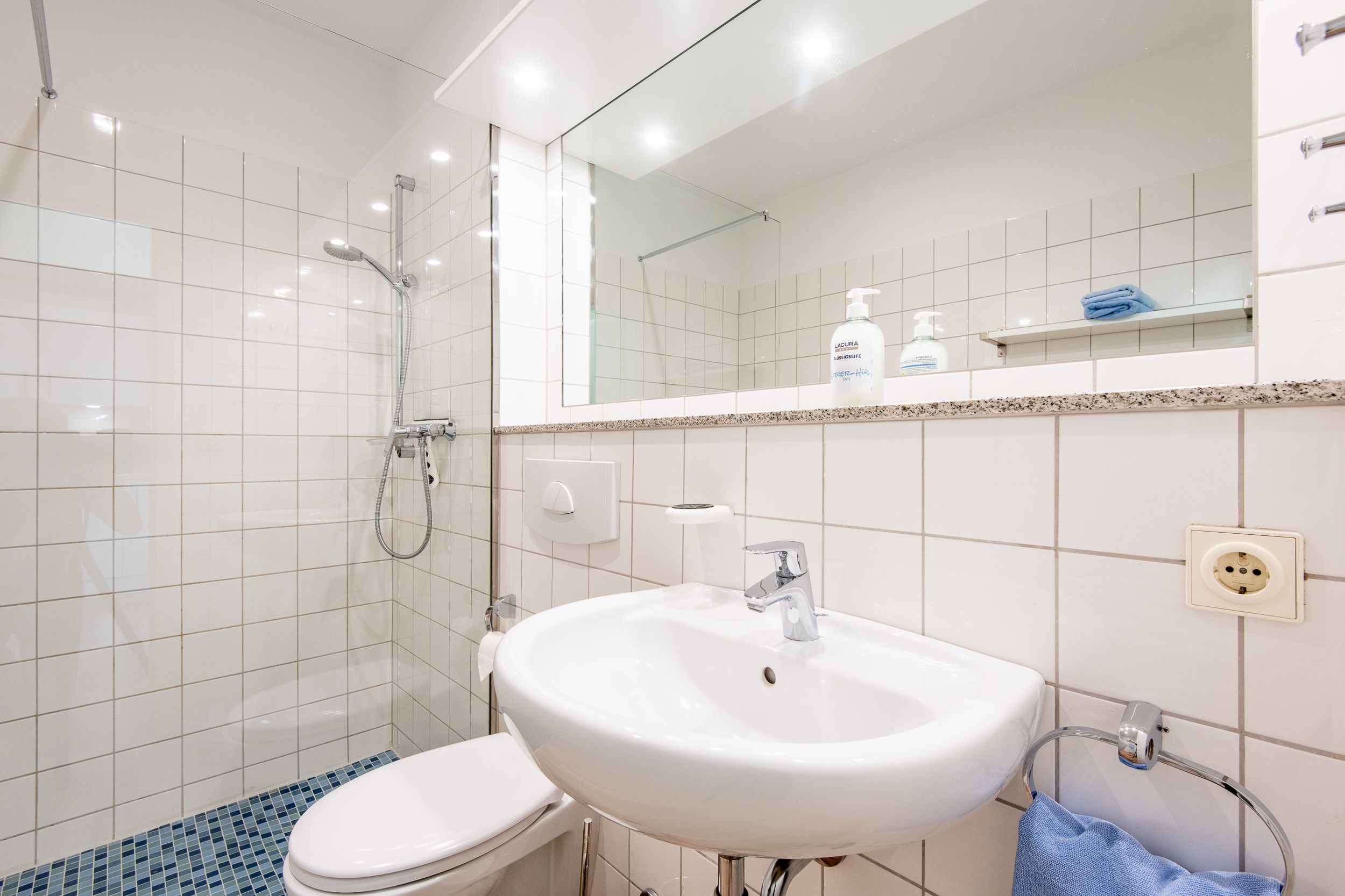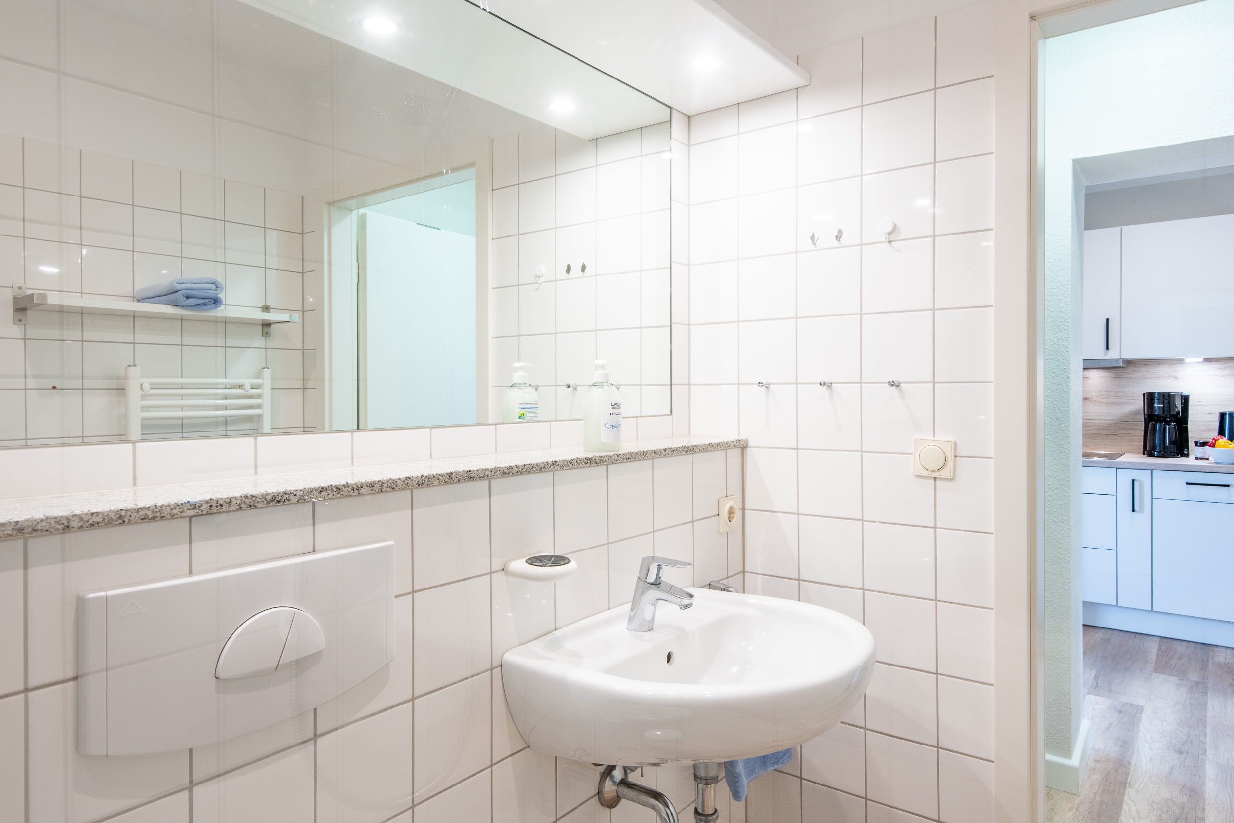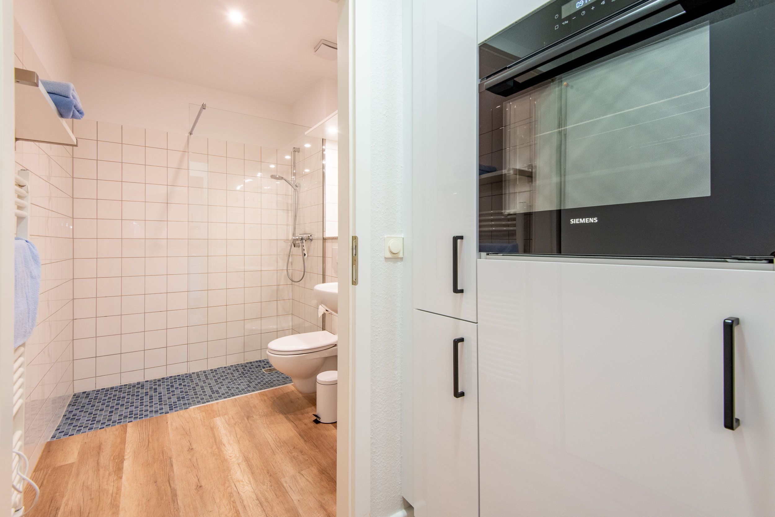 Das Badezimmer verfügt über eine ebenerdige Dusche, Waschbecken und WC und ist mit einer Elektroheizung ausgestattet, die auch als Handtuchwärmer genutzt werden kann.