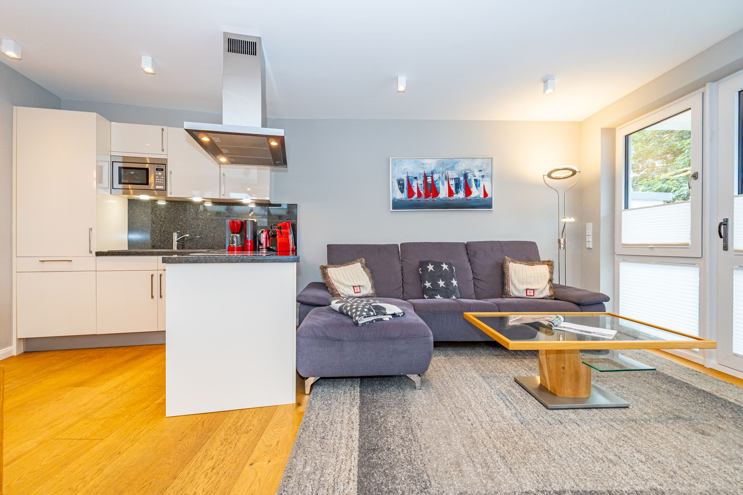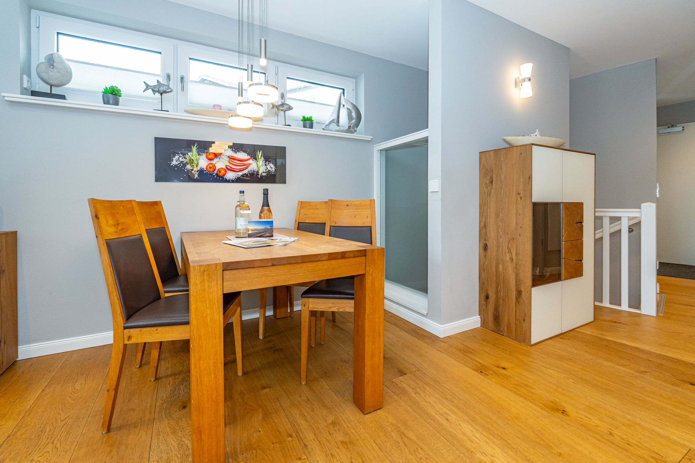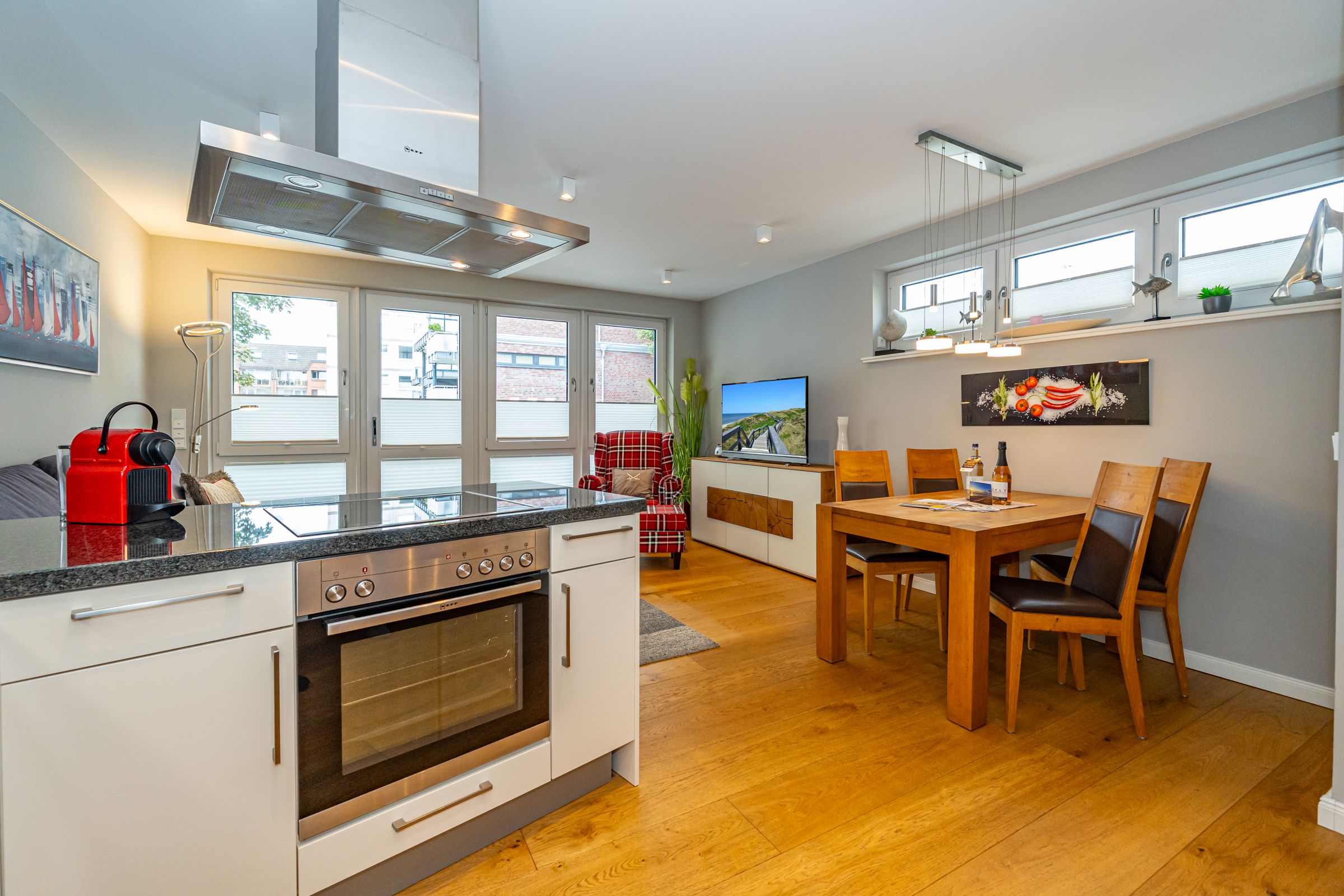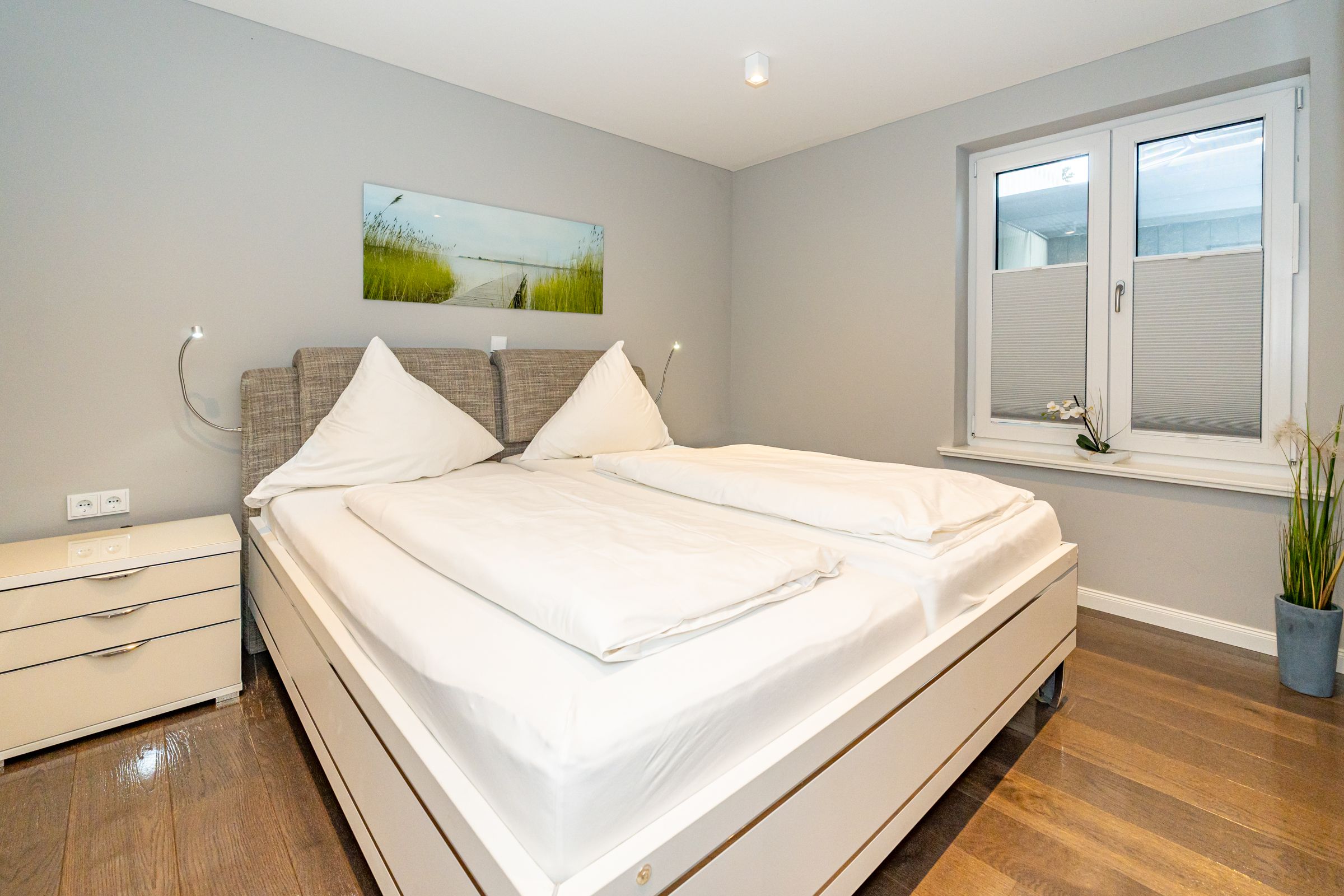 Die 3-Zimmer-Ferienwohnung teilt sich in Erdgeschoss und Untergeschoss auf. Das Erdgeschoss hat ein kombiniertes Wohn- & Esszimmer, das mit einer gemütlichen Sofalandschaft und Sessel, sowie einen TV und Esstisch ausgestattet ist. Von hier aus haben Sie Zugang zur westlich ausgerichteten Terrasse mit Gartenmöbeln und Strandkorb (saisonal). Die hochwertige, offene Küche ist ausgestattet mit einem Backofen, Geschirrspüler, Kaffeemaschine, Toaster und Wasserkocher. Auf der selben Ebene befindet sich ein Badezimmer mit Dusche und WC. Über eine Treppe gelangen Sie in das Untergeschoss. Hier befinden sich 2 geräumige Schlafzimmer mit Doppelbetten und TV. Ein Schlafzimmer hat einen begehbaren Kleiderschrank. In dem zweiten Duschbad mit WC stellen wir unseren Gästen eine Waschmaschine, einen Trockner, sowie eine Sauna zur Verfügung.