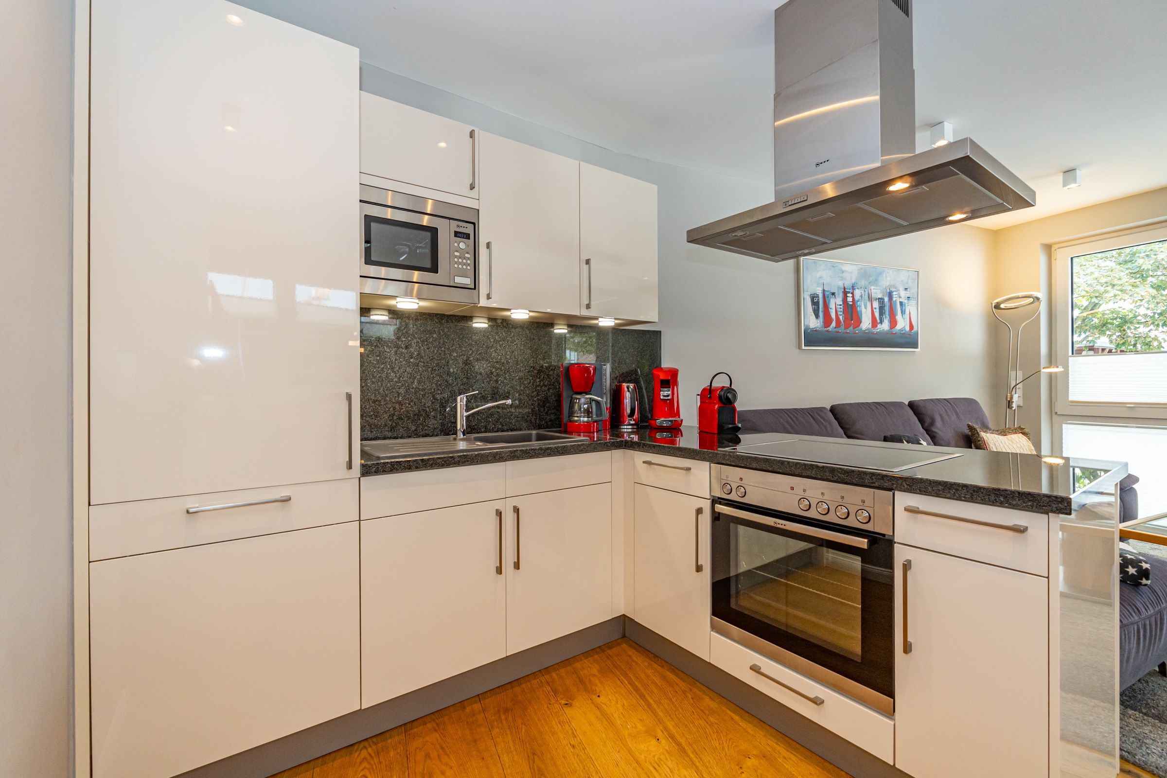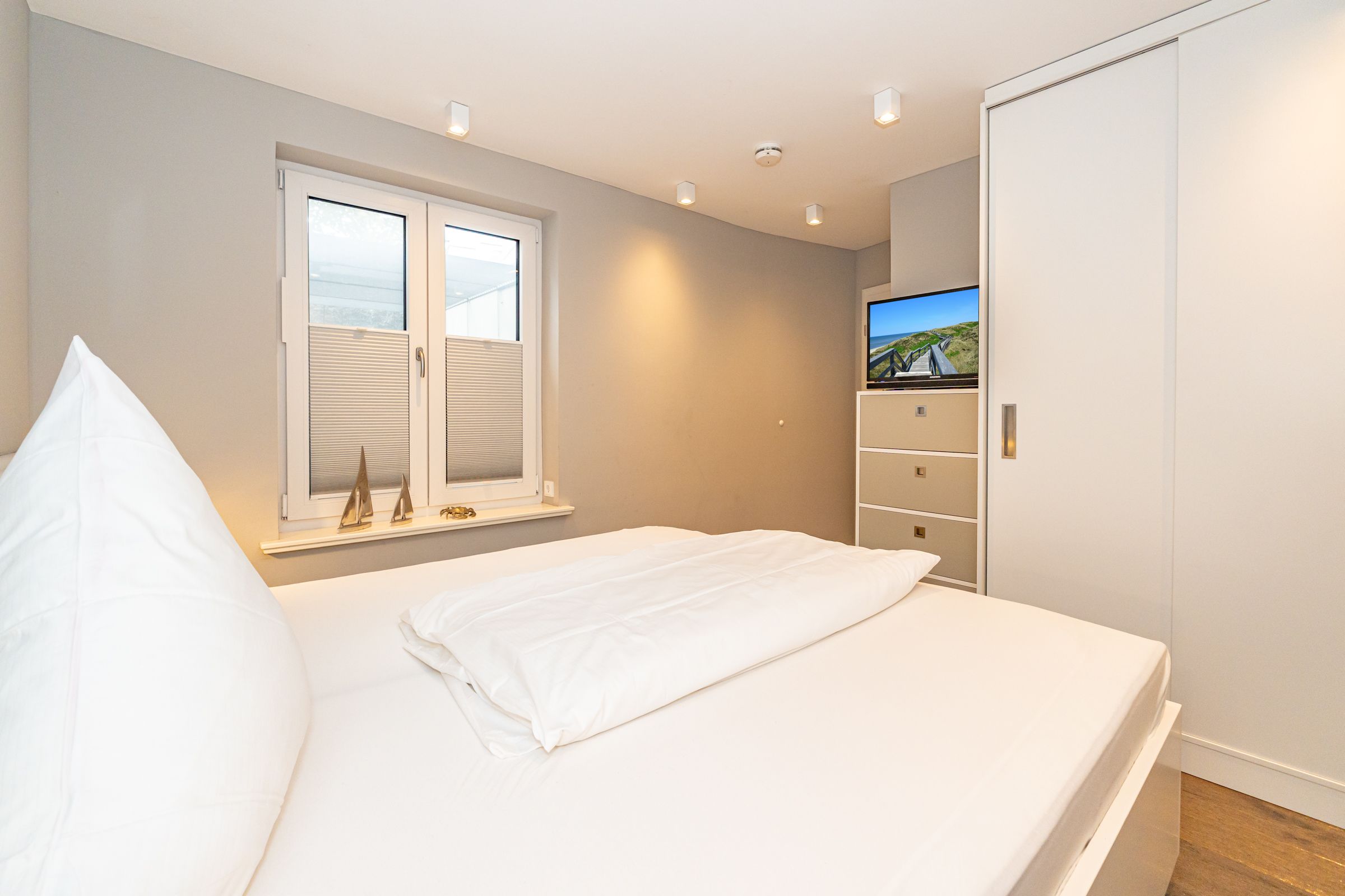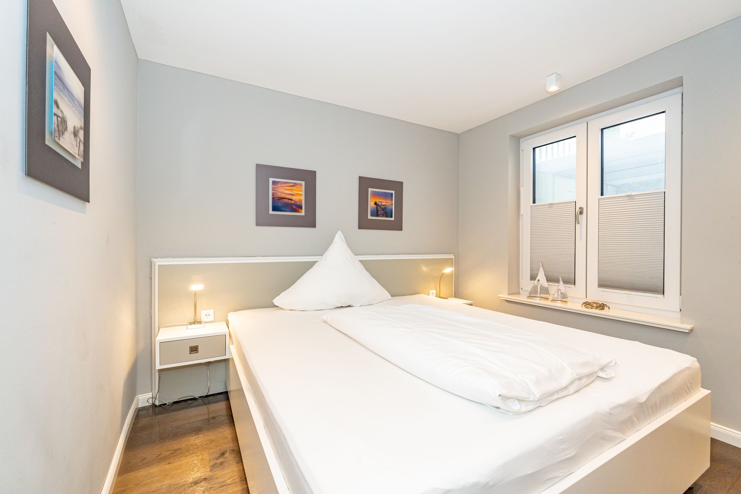 Die 3-Zimmer-Ferienwohnung teilt sich in Erdgeschoss und Untergeschoss auf. Das Erdgeschoss hat ein kombiniertes Wohn- & Esszimmer, das mit einer gemütlichen Sofalandschaft und Sessel, sowie einen TV und Esstisch ausgestattet ist. Von hier aus haben Sie Zugang zur westlich ausgerichteten Terrasse mit Gartenmöbeln und Strandkorb (saisonal). Die hochwertige, offene Küche ist ausgestattet mit einem Backofen, Geschirrspüler, Kaffeemaschine, Toaster und Wasserkocher. Auf der selben Ebene befindet sich ein Badezimmer mit Dusche und WC. Über eine Treppe gelangen Sie in das Untergeschoss. Hier befinden sich 2 geräumige Schlafzimmer mit Doppelbetten und TV. Ein Schlafzimmer hat einen begehbaren Kleiderschrank. In dem zweiten Duschbad mit WC stellen wir unseren Gästen eine Waschmaschine, einen Trockner, sowie eine Sauna zur Verfügung.