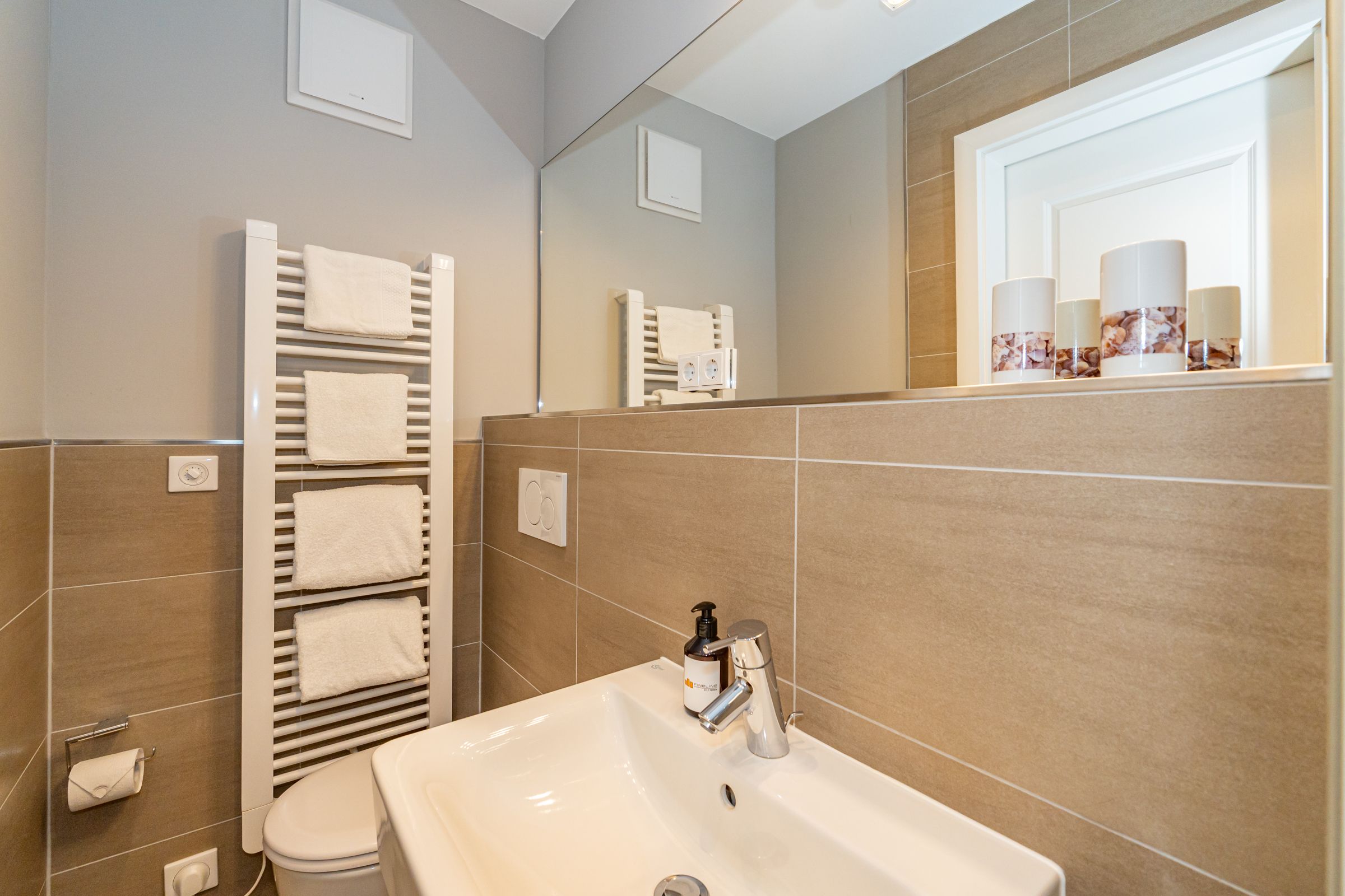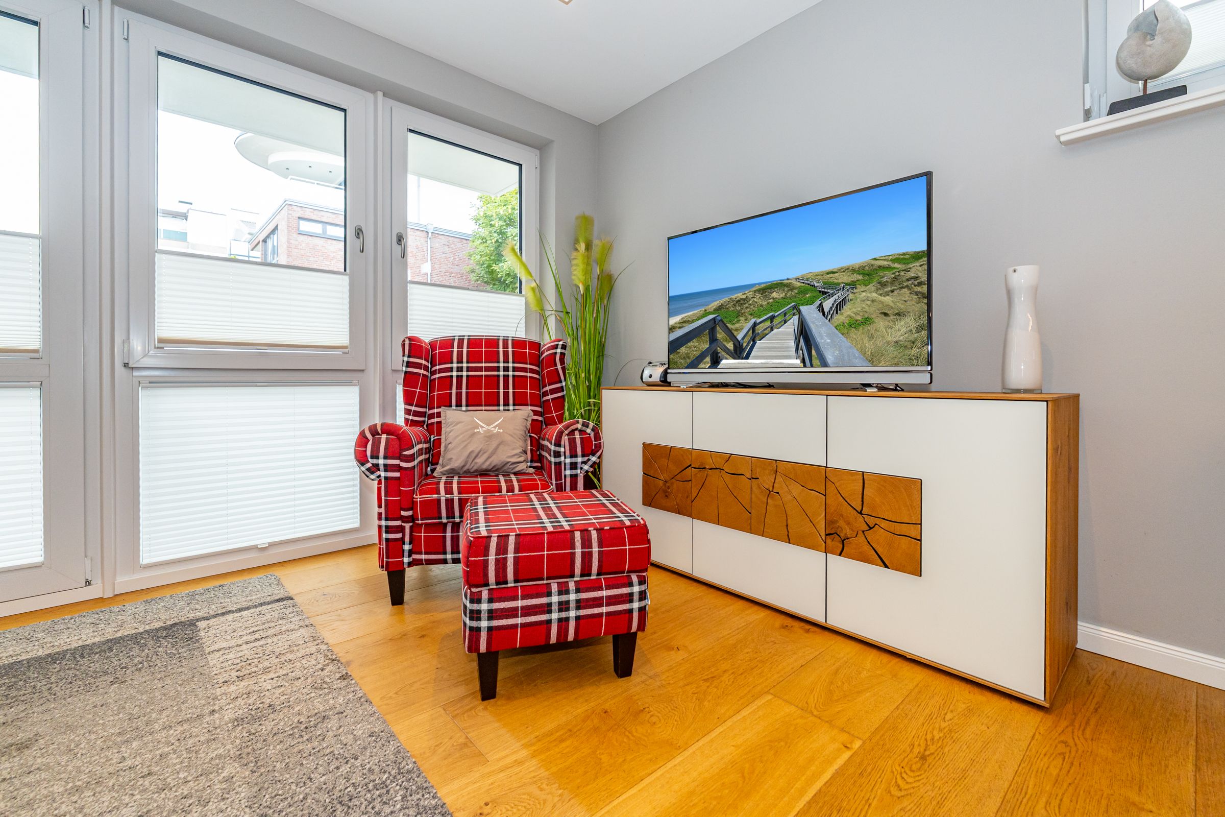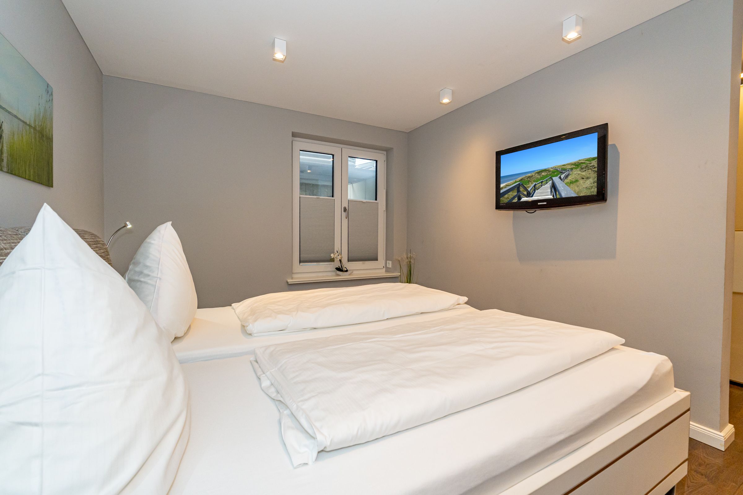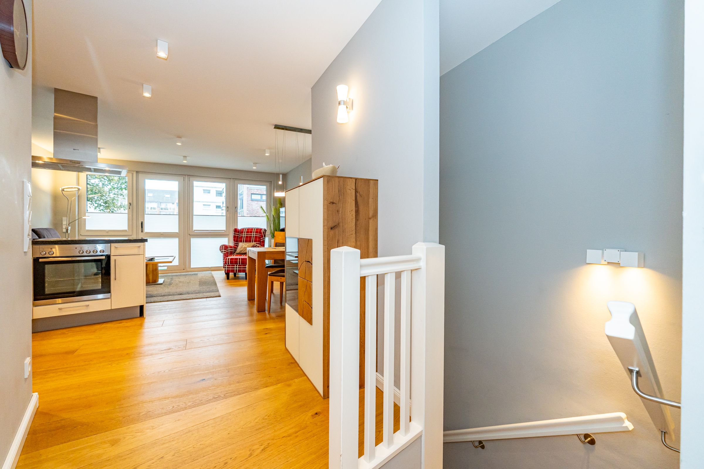 Die 3-Zimmer-Ferienwohnung teilt sich in Erdgeschoss und Untergeschoss auf. Das Erdgeschoss hat ein kombiniertes Wohn- & Esszimmer, das mit einer gemütlichen Sofalandschaft und Sessel, sowie einen TV und Esstisch ausgestattet ist. Von hier aus haben Sie Zugang zur westlich ausgerichteten Terrasse mit Gartenmöbeln und Strandkorb (saisonal). Die hochwertige, offene Küche ist ausgestattet mit einem Backofen, Geschirrspüler, Kaffeemaschine, Toaster und Wasserkocher. Auf der selben Ebene befindet sich ein Badezimmer mit Dusche und WC. Über eine Treppe gelangen Sie in das Untergeschoss. Hier befinden sich 2 geräumige Schlafzimmer mit Doppelbetten und TV. Ein Schlafzimmer hat einen begehbaren Kleiderschrank. In dem zweiten Duschbad mit WC stellen wir unseren Gästen eine Waschmaschine, einen Trockner, sowie eine Sauna zur Verfügung.