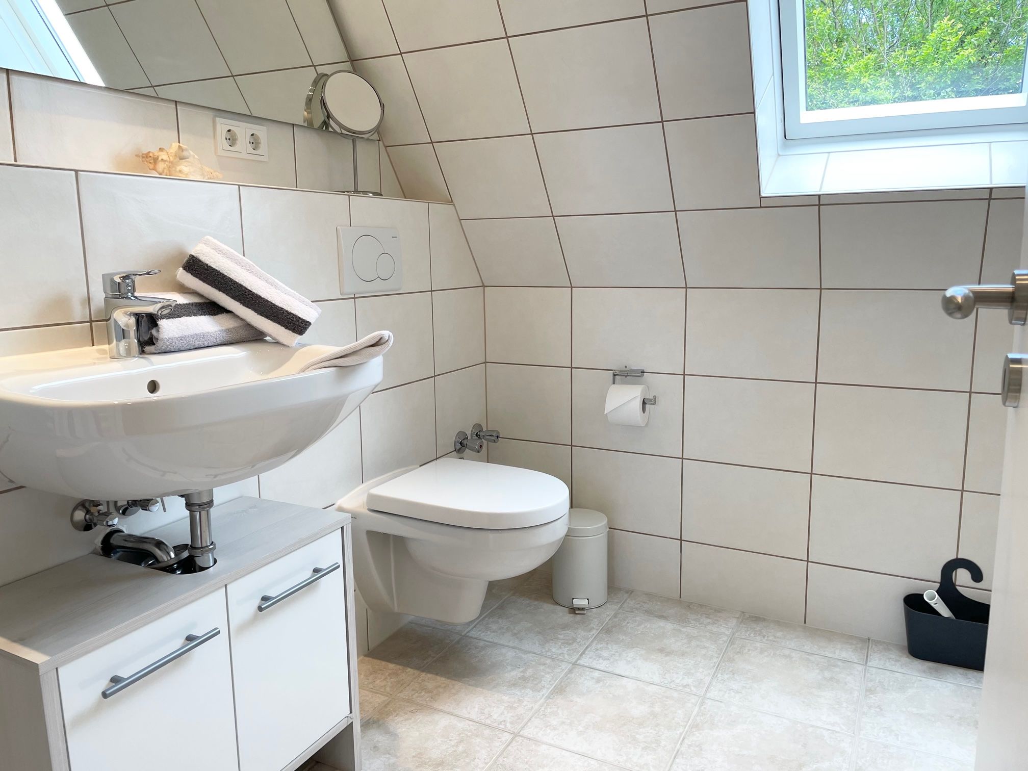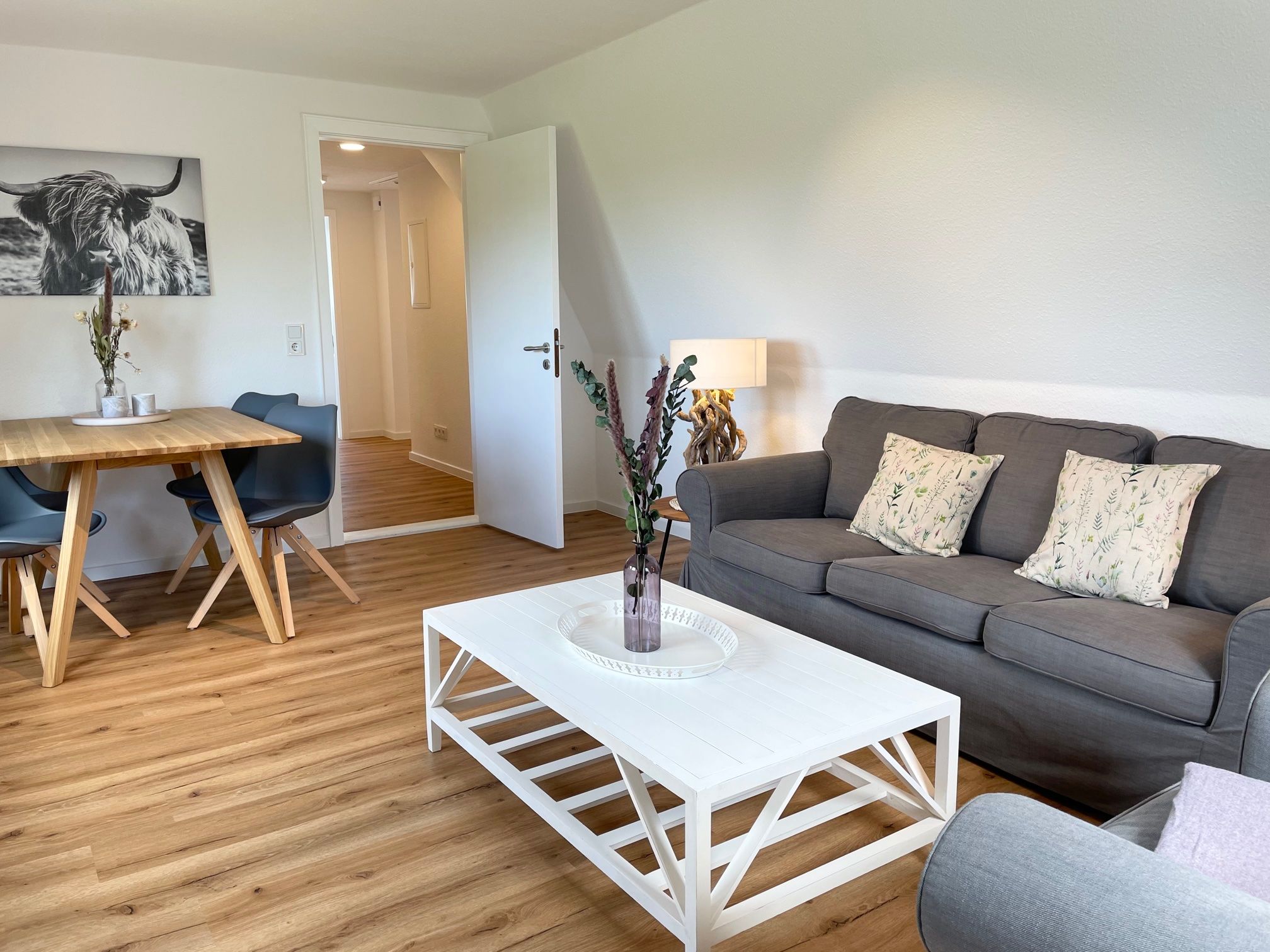 Die in 2021 vollständig renovierte hell und modern eingerichtete 5 Zimmer Wohnung verfügt über ein Wohnzimmer, drei Schlafzimmer und ein kleines Büro. Das Wohnzimmer bietet eine TV-Ecke mit Flat-Screen, einer Couch und einem Sessel. In der Sitzecke mit Esstisch können Sie z. B. ein ausgiebiges Frühstück genießen. Die vollausgestattete separate, helle Küche lässt keine Wünsche offen. Die drei Schlafzimmer bieten ausreichend Platz für die gesamte Familie. Zwei der drei Schlafzimmer sind jeweils mit einem Doppelbett ausgestattet, das dritte Schlafzimmer verfügt über ein Einzelbett. Außerdem gibt es ein kleines Büro mit Schreibtisch und Sitzgelegenheit. Weiterhin bietet die Wohnung ein helles Duschbad mit extra großer Dusche und ein zusätzliches Gäste-WC.