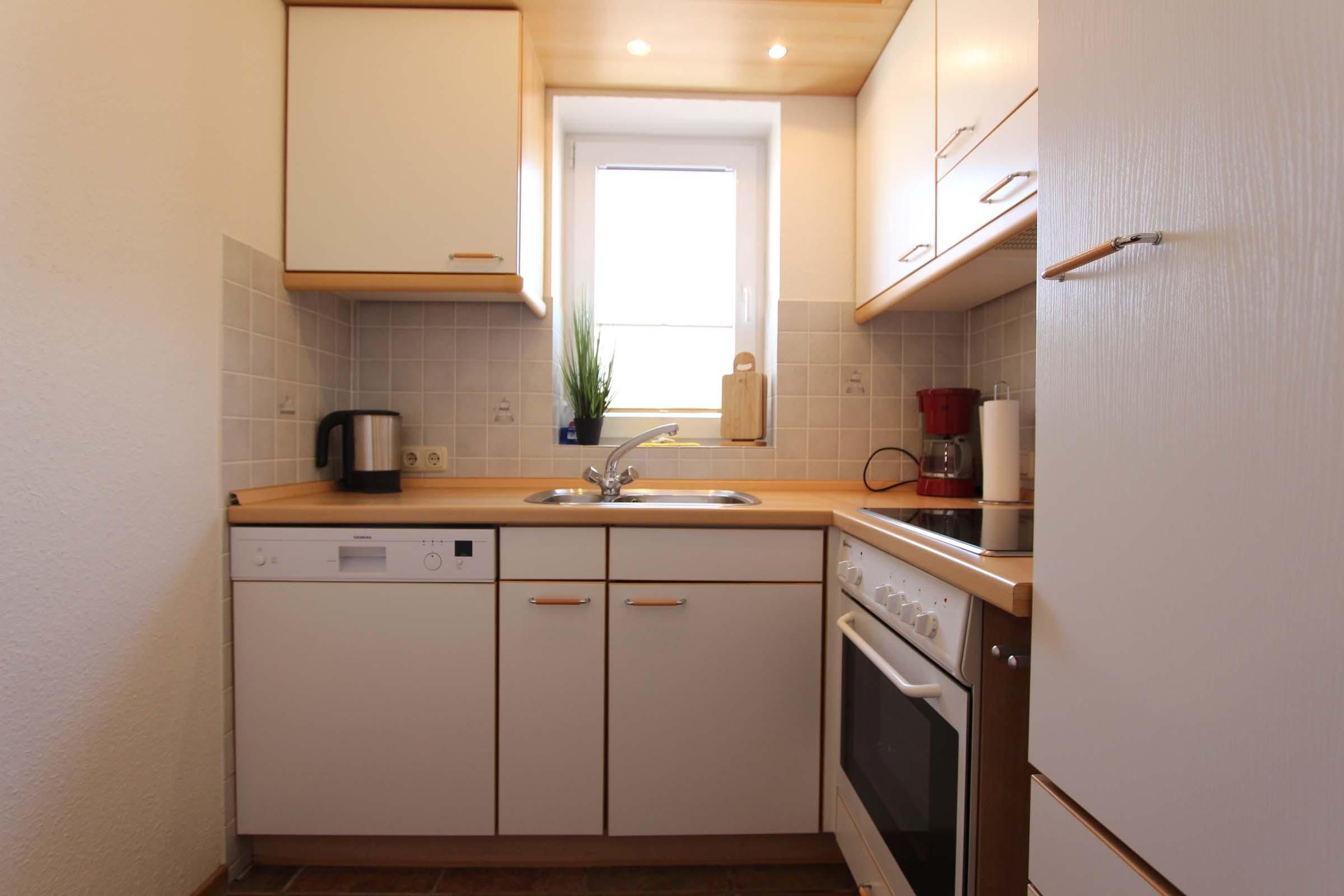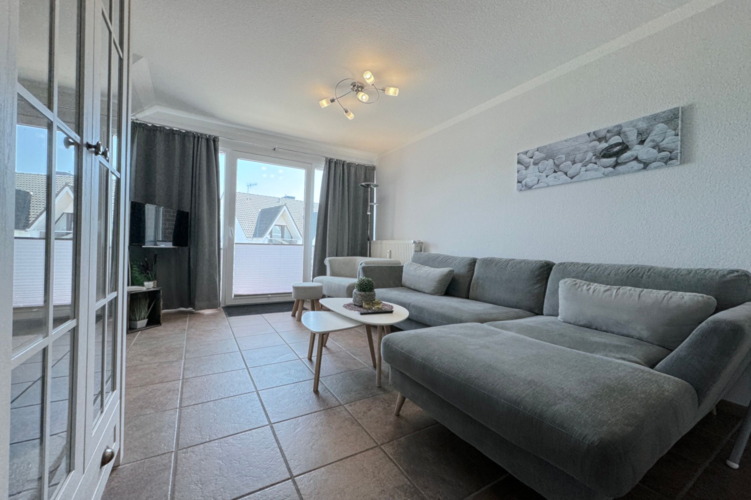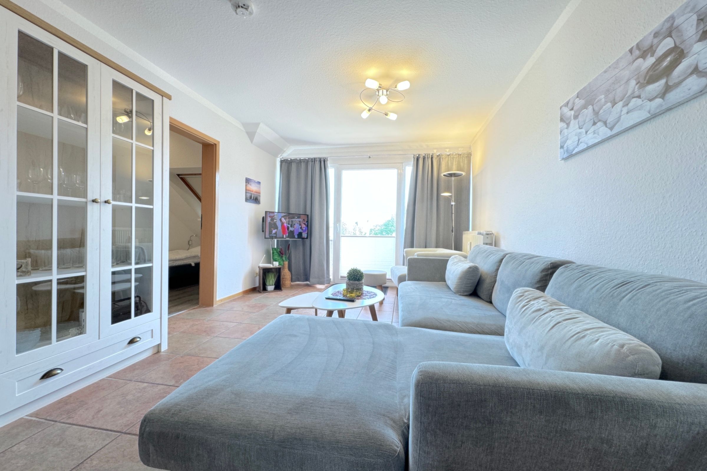 Der lichtdurchflutete Wohnbereich lädt mit einer großzügigen Sofaecke, einem bequemen Sessel und einem angrenzenden Essplatz zum Entspannen ein. Die separate Küche ist voll ausgestattet – inklusive Geschirrspüler, Mikrowelle und Backofen – und bietet alles, was man für die Selbstversorgung im Urlaub braucht.